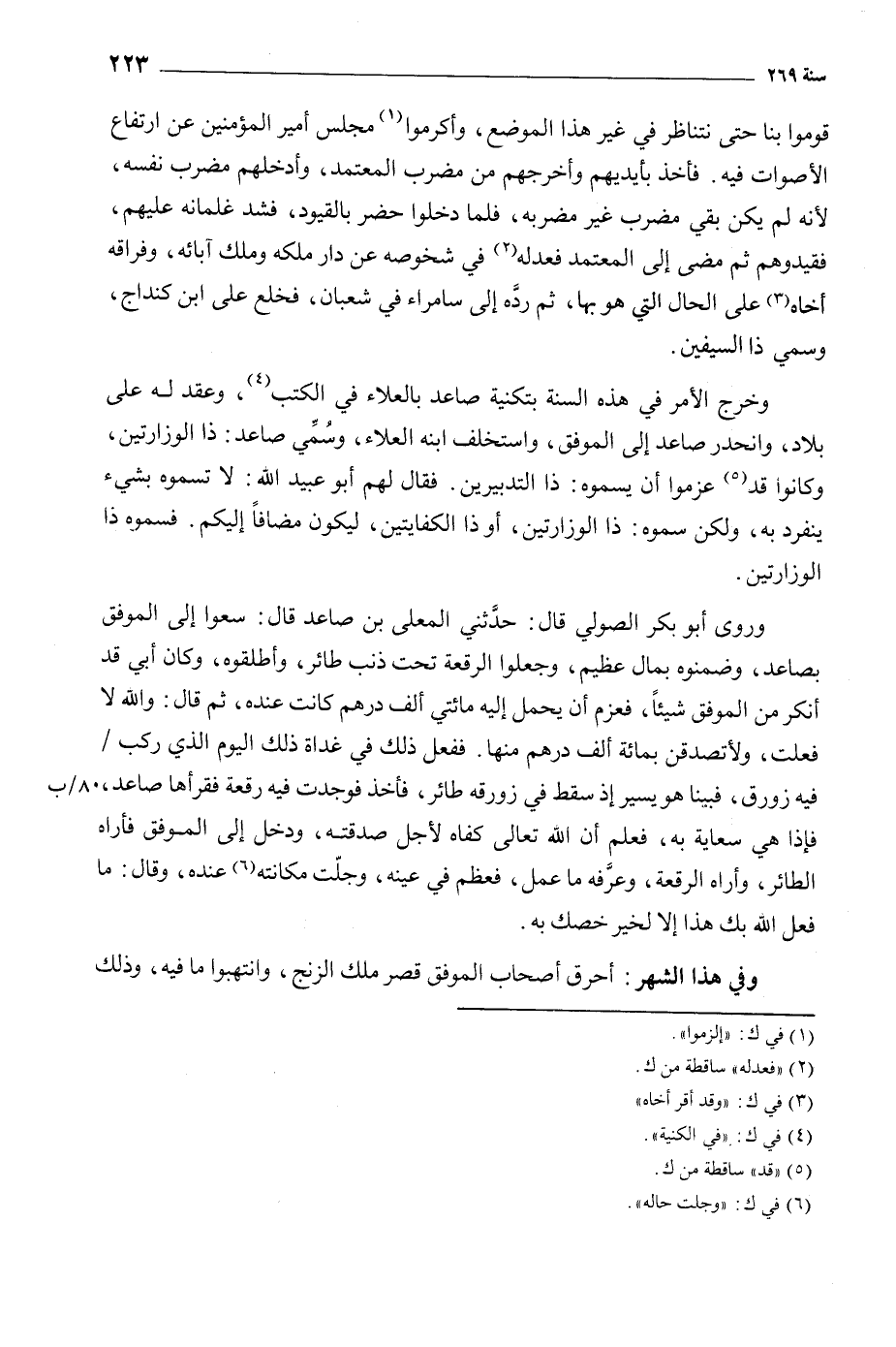 وخرج الأمر في هذه السنة بتكنية صاعد بالعلاء في الكتب [4] ، وعقد له على بلاد، وانحدر صاعد إلى الموفق، واستخلف ابنه العلاء، وسمى صاعد: ذا الوزارتين، وكانوا قد [5] عزموا أن يسموه: ذا التدبيرين. فقال لهم أبو عبيد الله: لا تسموه بشيء ينفرد به، ولكن سموه: ذا الوزارتين، أو ذا الكفايتين، ليكون مضافا إليكم. فسموه ذا الوزارتين.