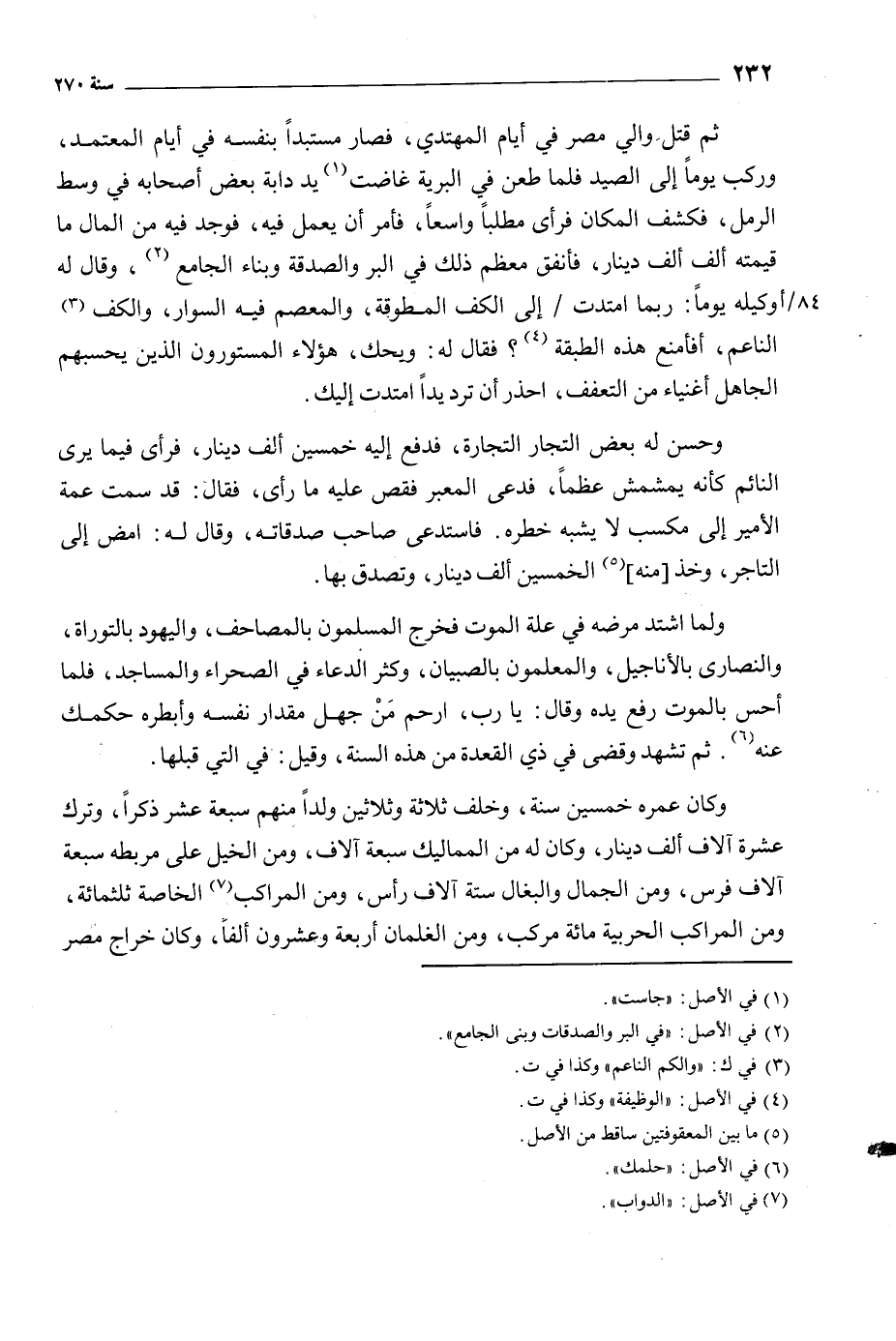 ثم قتل والى مصر في أيام المهتدي، فصار مستبدا بنفسه في أيام المعتمد، وركب يوما إلى الصيد فلما طعن في البرية غاضت [1] يد دابة بعض أصحابه في وسط الرمل، فكشف المكان فرآى مطلبا واسعا، فأمر أن يعمل فيه، فوجد فيه من المال ما قيمته ألف ألف دينار، فأنفق معظم ذلك في البر والصدقة وبناء الجامع [2] ، وَقَالَ له وكيله يوما: ربما امتدت/ إلى الكف المطوقة، والمعصم فيه السوار، والكف [3] الناعم، أفامنع هذه الطبقة [4] ؟ فقال له: ويحك، هؤلاء المستورون الذين يحسبهم الجاهل أغنياء من التعفف، احذر أن ترديدا أمتدت إليك.