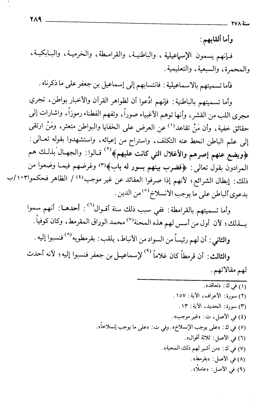 وَيَضَعُ عَنْهُمْ إِصْرَهُمْ وَالْأَغْلالَ الَّتِي كانَتْ عَلَيْهِمْ 7: 157 [2] قالوا: والجهال بذلك هم المرادون بقول تعالى: فَضُرِبَ بَيْنَهُمْ بِسُورٍ لَهُ بابٌ 57: 13 [3] وغرضهم فيما وضعوا من ذلك: إبطال الشرائع، لأنهم إذا صرفوا العقائد عن غير موجب [4] / الظاهر فحكموا بدعوى الباطن على ما يوجب الانسلاخ [5] من الدين.
