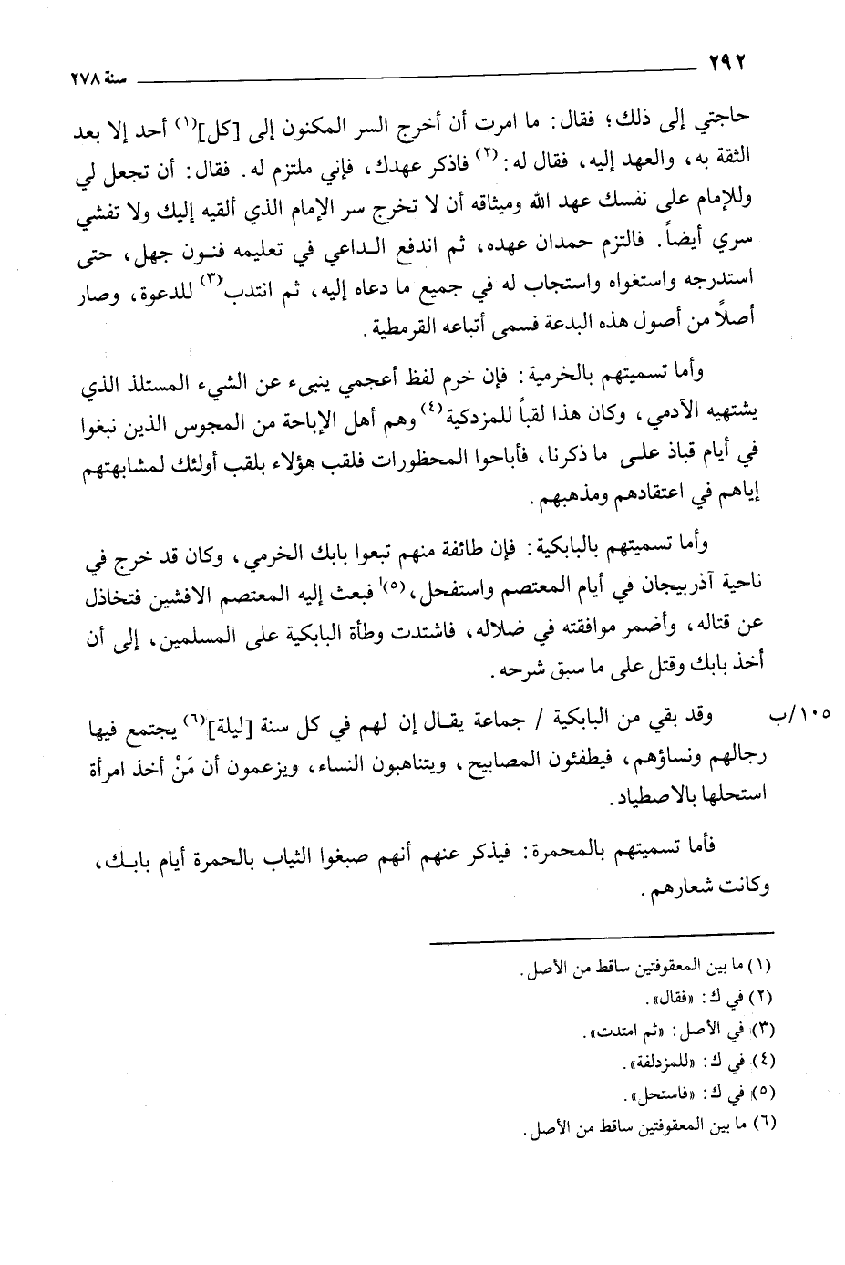 وأما تسميتهم بالخرمية: فإن خرم لفظ أعجمي ينبئ عن الشيء المستلذ الذي يشتهيه الآدمي، وكان هذا لقبا للمزدكية [4] وهم أهل الإباحة من المجوس الذين نبغوا في أيام قباذ على ما ذكرنا، فأباحوا المحظورات فلقب هؤلاء بلقب أولئك لمشابهتهم إياهم في اعتقادهم ومذهبهم.