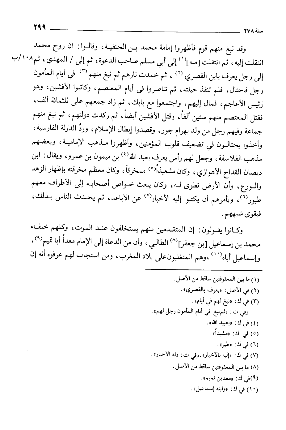 وقد نبغ منهم قوم فأظهروا إمامة مُحَمَّد ابن الحنفية، وقالوا: إن روح مُحَمَّد انتقلت إليه، ثم انتقلت [منه] [1] إلى أبي مسلم صاحب الدعوة، ثم إلى/ المهدي، ثم إلى رجل يعرف بابن القصري [2] ، ثم خمدت نارهم ثم نبغ منهم [3] في أيام المأمون رجل فاحتال، فلم تنفذ حيلته، ثم تناصروا في أيام المعتصم، وكاتبوا الأفشين، وهو رئيس الأعاجم، فمال إليهم، واجتمعوا مع بابك، ثم زاد جمعهم على ثلاثمائة ألف، فقتل المعتصم منهم ستين ألفا، وقتل الأفشين أيضا، ثم ركدت دولتهم، ثم نبغ منهم جماعة وفيهم رجل من ولد بهرام جور، وقصدوا إبطال الإسلام، ورد الدولة الفارسية، وأخذوا يحتالون في تضعيف قلوب المؤمنين، وأظهروا مذهب الإمامية، وبعضهم مذهب الفلاسفة، وجعل لهم رأس يعرف بعبد الله [4] بن ميمون بن عمرو، ويقال: ابن ديصان القداح الأهوازي، وكان مشعبذا [5] ممخرقا، وكان معظم مخرقته بإظهار الزهد والورع، وأن الأرض تطوى له، وكان يبعث خواص أصحابه إلى الأطراف معهم طيور [6] ، ويأمرهم أن يكتبوا إليه الأخبار [7] عن الأباعد، ثم يحدث الناس بذلك، فيقوى شبههم.