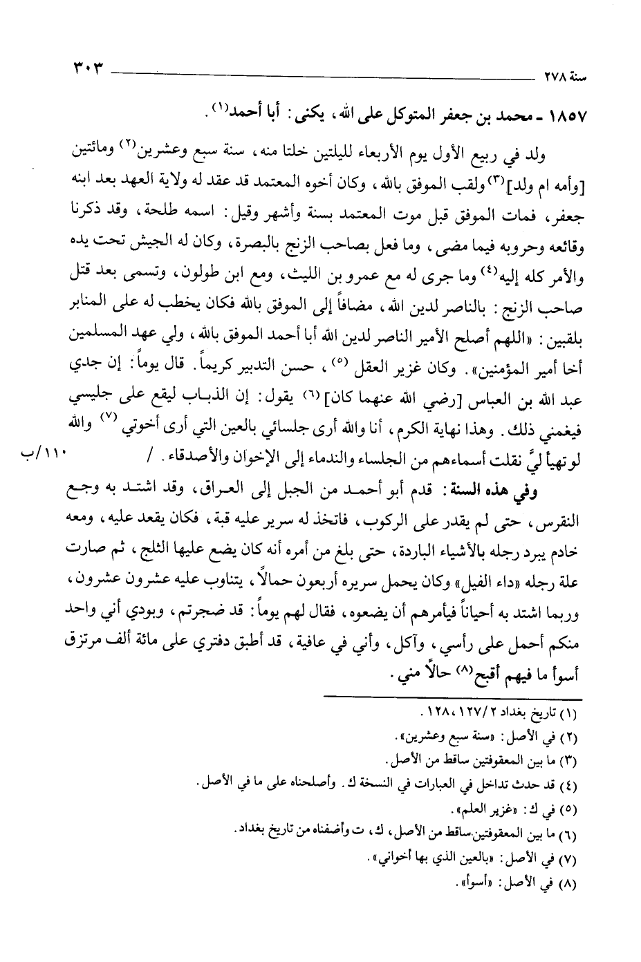 ولد في ربيع الأول يوم الأربعاء لليلتين خلتا منه، سنة سبع وعشرين [2] ومائتين [وأمه أم ولد] [3] ولقب الموفق باللَّه، وكان أخوه المعتمد قد عقد له ولاية العهد بعد ابنه جعفر، فمات الموفق قبل موت المعتمد بسنة وأشهر وقيل: اسمه طلحة، وقد ذكرنا وقائعه وحروبه فيما مضى، وما فعل بصاحب الزنج بالبصرة، وكان له الجيش تحت يده والأمر كله إليه [4] وما جرى له مع عمرو بن الليث، ومع ابن طولون، وتسمى بعد قتل صاحب الزنج: بالناصر لدين الله، مضافا إلى الموفق باللَّه فكان يخطب له على المنابر بلقبين: «اللَّهمّ أصلح الأمير الناصر لدين الله أبا أَحْمَد الموفق باللَّه، ولي عهد المسلمين أخا أمير المؤمنين» . وكان غزير العقل [5] ، حسن التدبير كريما. قَالَ يوما: إن جدي عَبْد اللَّهِ بن العباس [رضي الله عنهما كان] [6] يقول: إن الذباب ليقع على جليسي فيغمني ذلك. وهذا نهاية الكرم، أنا والله أرى جلسائي بالعين التي أرى إخوتي [7] والله لو تهيأ لي نقلت أسماءهم من الجلساء والندماء إلى الإخوان والأصدقاء. / وفي هذه السنة: قدم أبو أَحْمَد من الجبل إلى العراق، وقد اشتد به وجع النقرس، حتى لم يقدر على الركوب، فاتخذ له سرير عليه قبة، فكان يقعد عليه، ومعه خادم يبرد رجله بالأشياء الباردة، حتى بلغ من أمره أنه كان يضع عليها الثلج، ثم صارت علة رجله «داء الفيل» وكان يحمل سريره أربعون حمالا، يتناوب عليه عشرون عشرون، وربما اشتد به أحيانا فيأمرهم أن يضعوه، فقال لهم يوما: قد ضجرتم، وبودي أني واحد منكم أحمل على رأسي، وآكل، وأني في عافية، قد أطبق دفتري على مائة ألف مرتزق أسوأ ما فيهم أقبح [8] حالا مني.