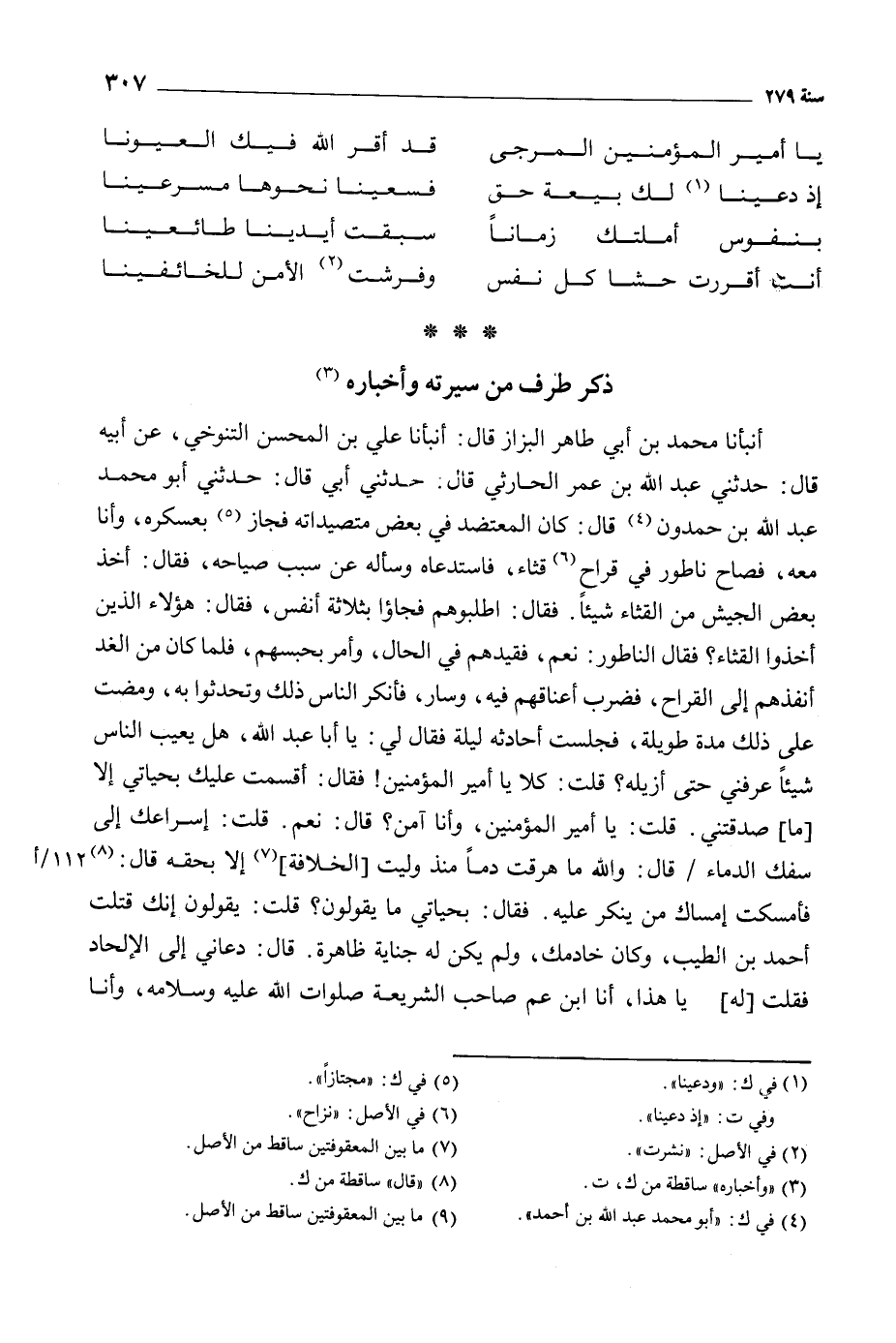 [3] أَنْبَأَنَا مُحَمَّد بْن أبي طاهر البزاز قَالَ: أَنْبَأَنَا عَلِي بْن المحسن التنوخي، عن أبيه قَالَ: حدثني عَبْد الله بن عمر الحارثي قال: حدثني أبي قال: حدثني أبو محمد عَبْد اللَّهِ بن حمدون [4] قَالَ: كان المعتضد في بعض متصيداته فجاز [5] بعسكره، وأنا معه، فصاح ناطور في قراح [6] قثاء، فاستدعاه وسأله عن سبب صياحه، فقال: أخذ بعض الجيش من القثاء شيئا. فقال: أطلبوهم فجاءوا بثلاثة أنفس، فقال: هؤلاء الذين أخذوا القثاء؟ فقال الناطور: نعم، فقيدهم في الحال، وأمر بحبسهم، فلما كان من الغد أنفذهم إلى القراح، فضرب أعناقهم فيه، وسار، فأنكر الناس ذلك وتحدثوا به، ومضت على ذلك مدة طويلة، فجلست أحادثه ليلة فقال لي: يا أبا عَبْد اللَّهِ، هل يعيب الناس شيئا عرفني حتى أزيله؟ قلت: كلا يا أمير المؤمنين! فقال: أقسمت عليك بحياتي إلا [ما] صدقتني. قلت: يا أمير المؤمنين، وأنا آمن؟ قَالَ: نعم. قلت: إسراعك إلى سفك الدماء/ قَالَ: والله ما هرقت دما منذ وليت [الخلافة] [7] إلا بحقه قَالَ: [8] فأمسكت إمساك من ينكر عليه. فقال: بحياتي ما يقولون؟ قلت: يقولون إنك قتلت أَحْمَد بن الطيب، وكان خادمك، ولم يكن له جناية ظاهرة. قَالَ: دعاني إلى الألحاد فقلت [له] [9] يا هذا، أنا ابن عم صاحب الشريعة صلوات الله عليه وسلامه، وأنا