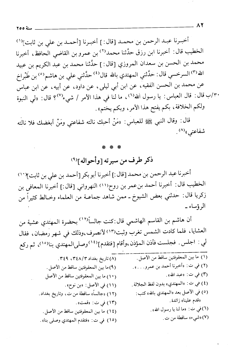 أَخْبَرَنَا عَبْد الرَّحْمَنِ بن مُحَمَّد [قَالَ:] أخبرنا أبو بكر [أحمد بن علي بن ثابت] [10] الخطيب قال: أخبرنا أحمد بن عمر بن روح [11] النهرواني [قال:] أخبرنا المعافى بن زكريا قال: حدثني بعض الشيوخ- ممن شاهد جماعة من العلماء وخالط كثيرا من الرؤساء- أن هاشم بن القاسم الهاشمي قَالَ: كنت جالسا [12] بحضرة المهتدي عشية من العشايا، فلما كادت الشمس تغرب وثبت [13] لأنصرف، وذلك في شهر رمضان، فقال لي: اجلس. فجلست فأذن المؤذن، وأقام [فتقدم] [14] وصلى المهتدي بنا [15] ، ثم ركع