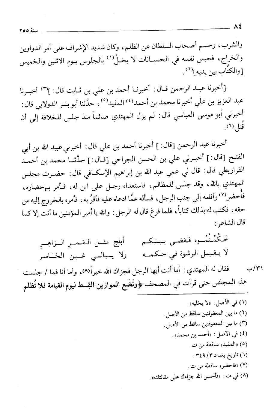 أَخْبَرَنَا عَبْد الرَّحْمَنِ [قال:] أخبرنا أحمد بن عَلِيِّ قَالَ: أَخْبَرَنِي عُبَيْدُ اللَّهِ بْنُ أَبِي الفتح [قَالَ:] أخبرني علي بن الحسن الجراحي [قَالَ:] حَدَّثَنَا مُحَمَّد بن أَحْمَد القراريطي قَالَ: قَالَ لي عمي عبد الله بن إبراهيم الإسكافي قَالَ: حضرت مجلس المهتدي باللَّه، وقد جلس للمظالم، فاستعداه رجل على ابن له، فأمر بإحضاره، فأحضر [7] وأقامه إلى جنب الرجل، فسأله عما ادعاه عليه فأقر بِهِ، فأمره بالخروج إليه من حقه، فكتب له بذلك كتابا، فلما فرغ قَالَ له الرجل: والله يا أمير المؤمنين ما أنت إلا كما قَالَ الشاعر:
