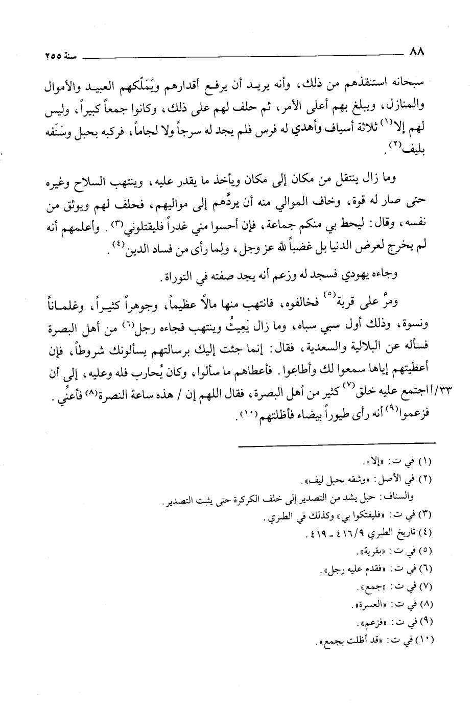 ومر على قرية [5] فخالفوه، فانتهب منها مالا عظيما، وجوهرا كثيرا، وغلمانا ونسوة، وذلك أول سبي سباه، وما زال يعيث وينتهب فجاءه رجل [6] من أهل البصرة فسأله عن البلالية والسعدية، فقال: إنما جئت إليك برسالتهم يسألونك شروطا، فإن أعطيتهم إياها سمعوا لك وأطاعوا. فأعطاهم ما سألوا، وكان يحارب فله وعليه، إلى أن اجتمع عليه خلق [7] كثير من أهل البصرة، فقال اللَّهمّ إن هذه ساعة النصرة [8] فأعني.