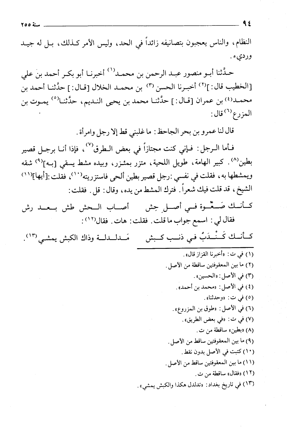 فأما الرجل: فإني كنت مجتازا في بعض الطرق [7] ، فإذا أنا برجل قصير بطين [8] . كبير الهامة، طويل اللحية، متزر بمئزر، وبيده مشط يسقي [به] [9] شقه ويمشطها به، فقلت في نفسي: رجل قصير بطين ألحى فاستزريته [10] ، فقلت: [أيها] [11] الشيخ، قد قلت فيك شعرا. فترك المشط من يده، وَقَالَ: قل. فقلت: