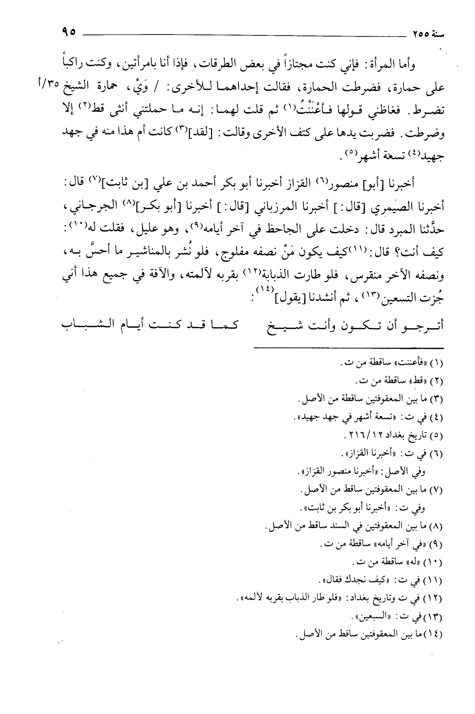 كيف أنت؟ قَالَ: [11] كيف يكون من نصفه مفلوج، فلو نشر بالمناشير ما أحس به، ونصفه الآخر منقرس، فلو طارت الذبابة [12] بقربه لآلمته، والآفة فِي جميع هذا أني جزت التسعين [13] ، ثم أنشدنا [يقول] [14] :