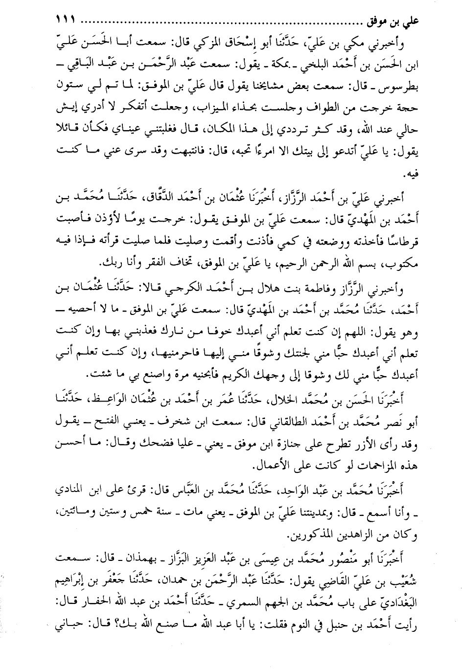 وأَخْبَرَنِي الرزاز وفاطمة بنت هلال بْن أَحْمَد الكرجي قالا: حَدَّثَنَا عثمان بن أحمد، حَدَّثَنَا مُحَمَّد بْن أَحْمَد بْن المهدي قَالَ: سمعت عليّ بن الموفق- ما لا أحصيه- وهو يَقُولُ: اللهم إن كنت تعلم أني أعبدك خوفا من نارك فعذبني بها وإن كنت تعلم أني أعبدك حبا مني لجنتك وشوقا مني إليها فاحرمنيها، وإن كنت تعلم أني أعبدك حبا مني لك وشوقا إِلَى وجهك الكريم فأبحنيه مرة واصنع بي ما شئت.