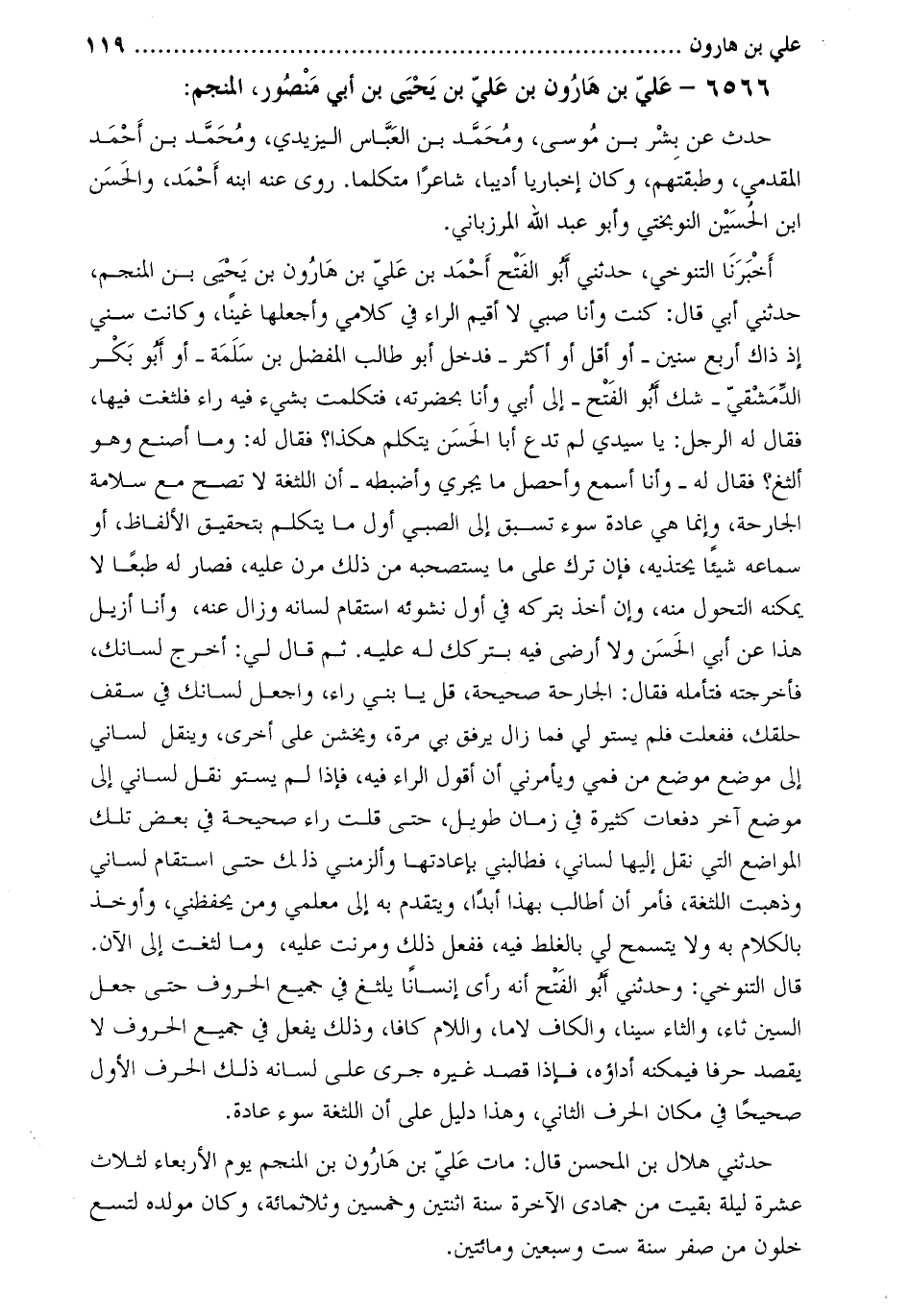 أخبرنا التنوخي، حَدَّثَنِي أَبُو الفتح أَحْمَد بْن عَلِيّ بْن هارون بْن يَحْيَى بْن المنجم، حَدَّثَنِي أَبِي قَالَ: كنت وأنا صبي لا أقيم الراء فِي كلامي وأجعلها غينا، وكانت سني إذ ذاك أربع سنين- أو أقل أو أكثر- فدخل أَبُو طالب المفضل بْن سلمة- أو أَبُو بكر الدمشقي- شك أَبُو الفتح- إِلَى أَبِي وأنا بحضرته، فتكلمت بشيء فيه راء فلثغت فيها، فقال له الرجل: يا سيدي لم تدع أبا الحسن يتكلم هكذا؟ فقال له: وما أصنع وهو ألثغ؟ فقال له- وأنا أسمع وأحصل ما يجري وأضبطه- إن اللثغة لا تصح مع سلامة الجارحة، وإنما هي عادة سوء تسبق إِلَى الصبي أول ما يتكلم بتحقيق الألفاظ، أو سماعه شيئا يحتذيه، فإن ترك على ما يستصحبه من ذلك مرن عليه، فصار له طبعا لا يمكنه التحول منه، وإن أخذ بتركه في أول نشوئه استقام لسانه وزال عنه، وأنا أزيل هذا عَن أَبِي الحسن ولا أرضى فيه بتركك له عليه. ثم قَالَ لي: أخرج لسانك، فأخرجته فتأمله فقال: الجارحة صحيحة، قل يا بني راء، واجعل لسانك فِي سقف حلقك، ففعلت فلم يستو لي فما زال يرفق بي مرة، ويخشن علي أخرى، وينقل لساني إِلَى موضع موضع من فمي ويأمرني أن أقول الراء فيه، فإذا لم يستو نقل لساني إِلَى موضع آخر دفعات كثيرة فِي زمان طويل، حتى قلت راء صحيحة فِي بعض تلك المواضع التي نقل إليها لساني، فطالبني بإعادتها وألزمني ذلك حتى استقام لساني وذهبت اللثغة، فأمر أن أطالب بهذا أبدا، ويتقدم به إِلَى معلمي ومن يحفظني، وأوخذ بالكلام به ولا يتسمح لي بالغلط فيه، ففعل ذلك ومرنت عليه، وما لثغت إِلَى الآن.