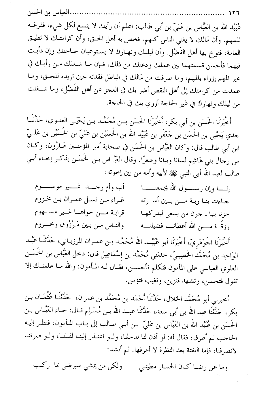 أَخْبَرَنَا الحسن بْن أبي بكر، أَخْبَرَنَا الْحَسَنُ بْنُ مُحَمَّدِ بْنِ يَحْيَى الْعَلَوِيُّ، حَدَّثَنَا جدي يَحْيَى بْن الْحَسَن بْن جَعْفَر بن عُبَيْد اللَّهِ بْن الْحُسَيْن بْن عَلِيّ بْن الْحُسَيْن بْن عليّ ابن أبي طالب قَالَ: وكان العباس بْن الحسن في صحابة أمير المؤمنين هارون، وكان من رجال بني هاشم لسانا وبيانا وشعرا. وَقَالَ العباس بْن الحسن يذكر إخاء أبي طالب لعبد اللَّه أبي النَّبِيّ صَلَّى اللَّهُ عَلَيْهِ وَسَلَّمَ لأبيه وأمه من بين إخوته: