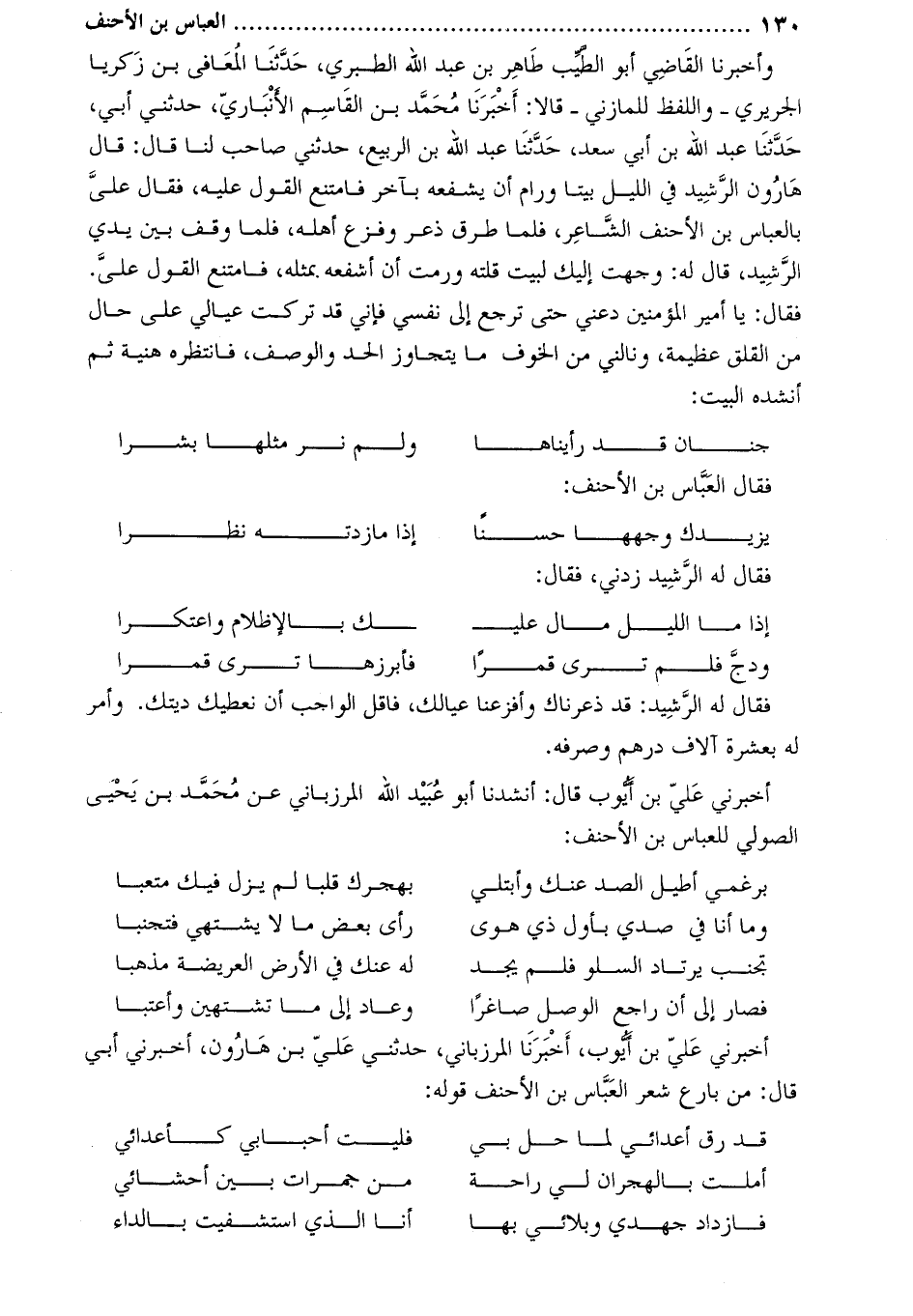 أَخْبَرَنِي علي بْن أيوب قَالَ: أنشدنا أَبُو عبيد اللَّه المرزباني عَنْ مُحَمَّد بْن يحيى الصولي للعباس بْن الأحنف: