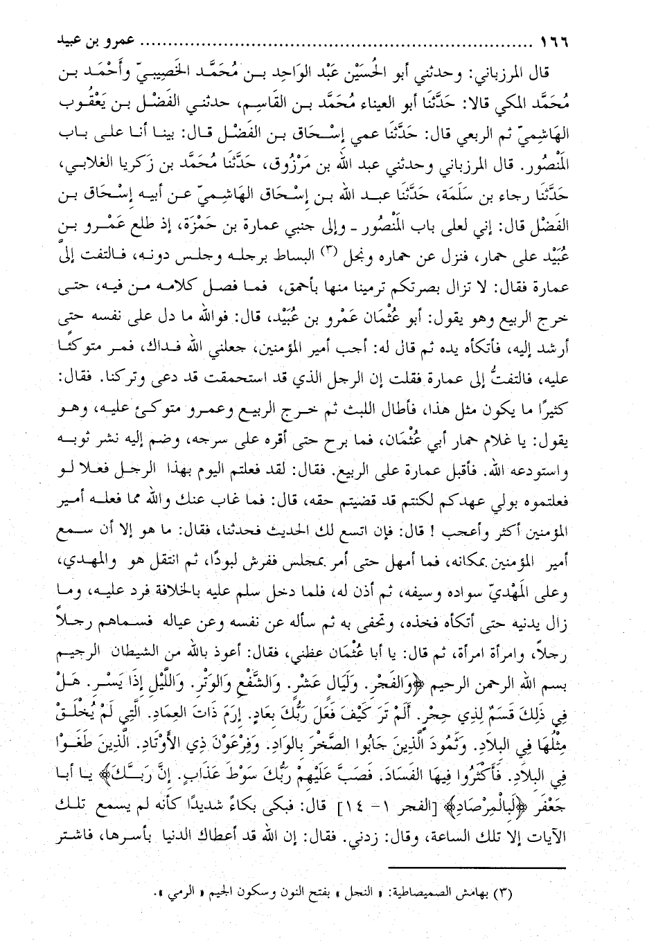 قَالَ المرزباني: وحَدَّثَنِي أَبُو الحسين عَبْد الواحد بْن مُحَمَّد الخصيبي وأحمد بْن مُحَمَّد المكي قالا: حَدَّثَنَا أَبُو العيناء مُحَمَّد بْن القاسم، حَدَّثَنِي الفضل بْن يعقوب الهاشمي ثم الربعي قال: حدّثنا عمي إسحاق بْن الفضل قَالَ: بينا أنا على باب المنصور. قَالَ المرزباني وَحَدَّثَنِي عبد الله بن مرزوق، حدّثنا محمّد بن زكريا الغلابي، حدّثنا رجاء بن سلمة، حَدَّثَنَا عبد اللَّه بْن إسحاق الهاشمي عَنْ أبيه إسحاق بْن الفضل قَالَ: إني لعلي باب المنصور- وإلى جنبي عمارة بْن حمزة، إذ طلع عمرو بْن عبيد على حمار، فنزل عن حماره ونجل [1] البساط برجله وجلس دونه، فالتفت إلي عمارة فقال: لا تزال بصرتكم ترمينا منها بأحمق، فما فصل كلامه من فيه، حتى خرج الربيع وهو يقول: أَبُو عثمان عمرو بْن عبيد، قَالَ: فو الله ما دل على نفسه حتى أرشد إليه، فأتكاه يده ثم قَالَ له: أجب أمير المؤمنين، جعلني اللَّه فداك، فمر متوكئا عليه، فالتفت إلى عمارة فقلت إن الرجل الذي قد استحمقت قد دعي وتركنا. فقال: