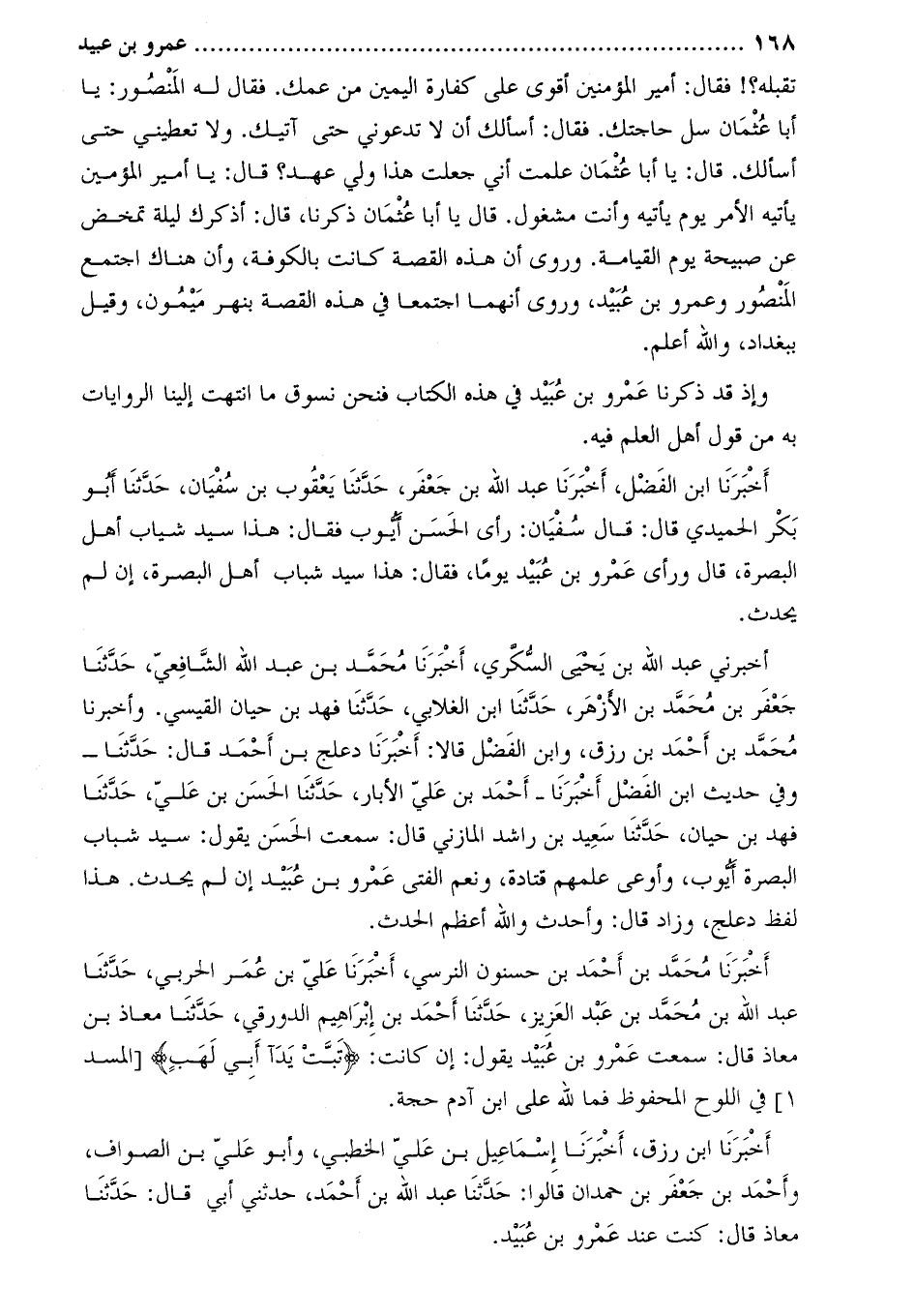 أَخْبَرَنَا ابْن رزق، أَخْبَرَنَا إسماعيل بن علي الخطبي، وأبو علي بن الصواف، وأحمد بْن جَعْفَر بْن حمدان قالوا: حَدَّثَنَا عَبْد الله بن أحمد، حَدَّثَنِي أبي قَالَ: حَدَّثَنَا معاذ قَالَ: كنت عند عمرو بْن عبيد.