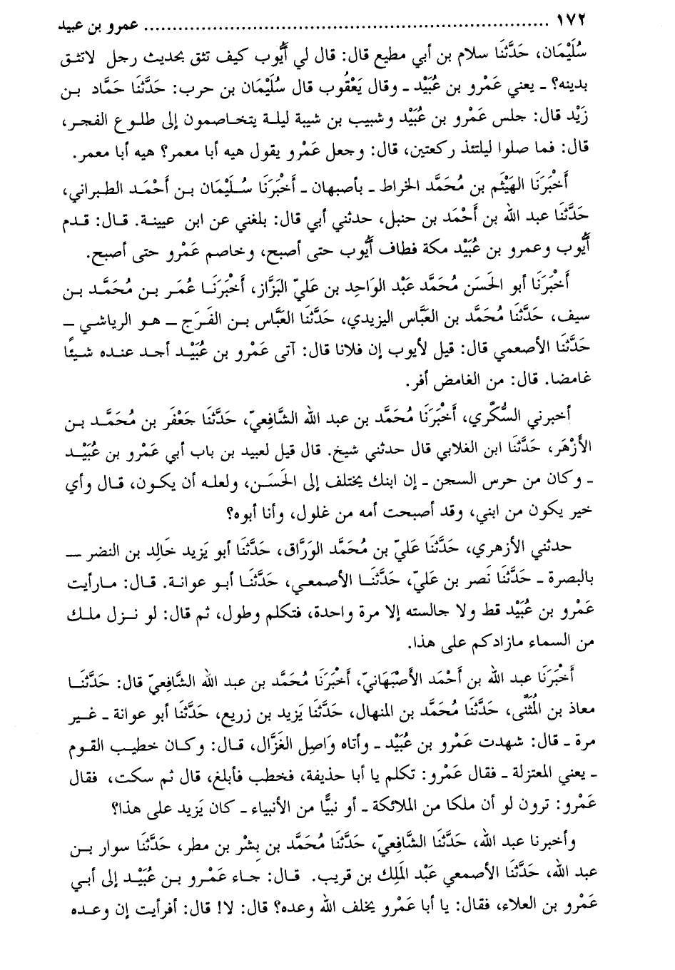 حدثني الأزهري، حدّثنا عليّ بن محمّد الورّاق، حَدَّثَنَا أَبُو يزيد خالد بْن النضر- بالبصرة- حدّثنا نصر بن عليّ، حدّثنا الأصمعي، حَدَّثَنَا أَبُو عوانة. قَالَ: ما رأيت عمرو بْن عُبَيْدَ قط ولا جالسته إلا مرة واحدة، فتكلم وطول، ثم قَالَ: لو نزل ملك من السماء ما زادكم على هذا.