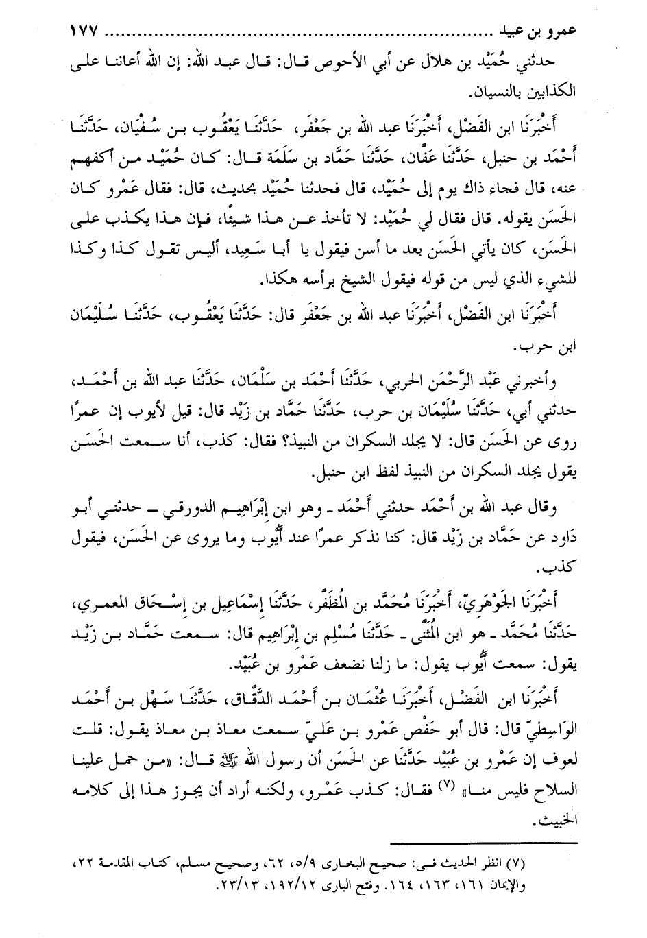 أخبرنا ابن الفضل، أخبرنا عثمان بن أحمد الدّقّاق، حَدَّثَنَا سَهْلُ بْنُ أَحْمَدَ الْوَاسِطِيُّ قَالَ: قَالَ أَبُو حَفْصٍ عَمْرُو بْن عَلِيّ سَمِعْتُ مُعَاذَ بْنَ مُعَاذٍ يَقُولُ: قُلْتُ لِعَوْفٍ إِنَّ عَمْرَو بْنَ عُبَيْدٍ حَدَّثَنَا عَنِ الْحَسَنِ أَنَّ رَسُولَ اللَّهِ صَلَّى اللَّهُ عَلَيْهِ وَسَلَّمَ قَالَ: «مَنْ حَمَلَ عَلَيْنَا السِّلاحَ فَلَيْسَ مِنَّا» [1]