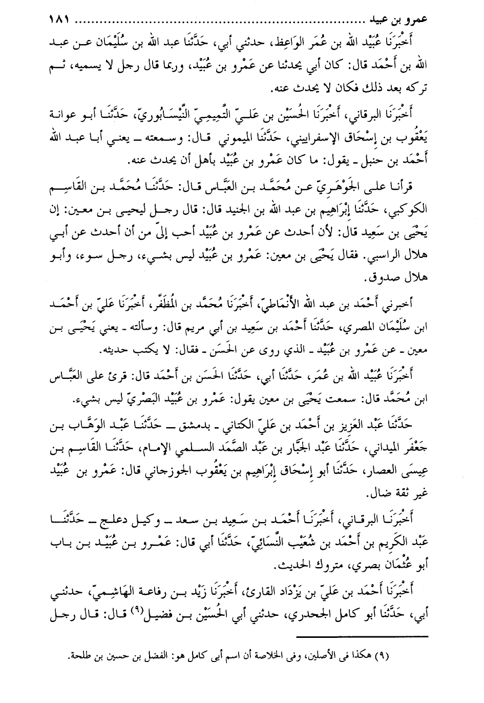 حَدَّثَنَا عبد العزيز بن أَحْمَد بن علي الكتاني- بدمشق- حدّثنا عبد الوهّاب بن جعفر الميداني، حَدَّثَنَا عبد الجبار بن عبد الصمد السلمي الإمام، حدّثنا القاسم بن عيسى العصار، حَدَّثَنَا أَبُو إسحاق إبراهيم بْن يعقوب الجوزجاني قَالَ: عمرو بْن عبيد غير ثقة ضال.