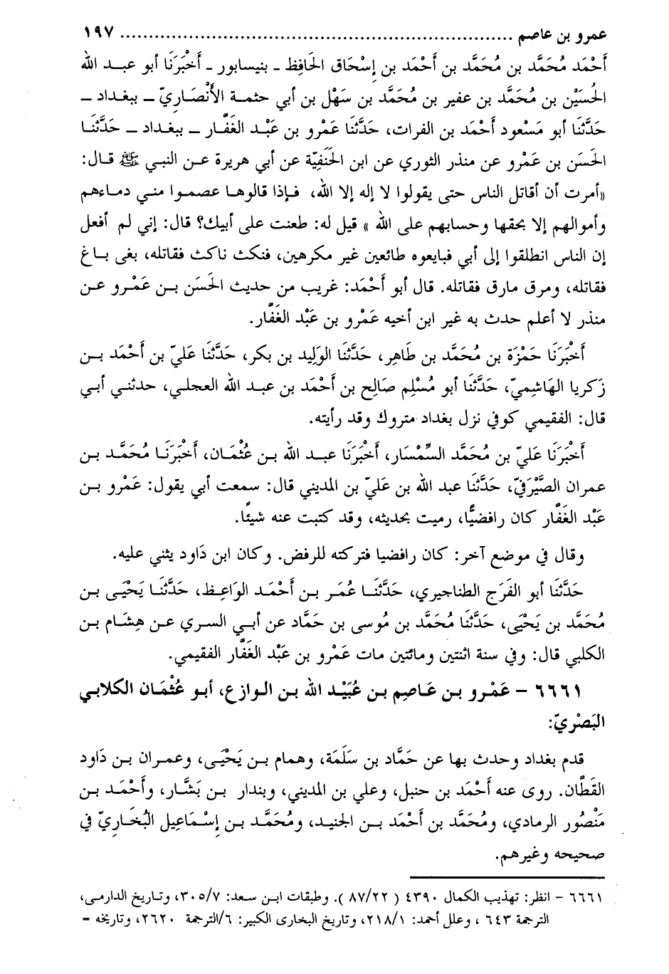 حَدَّثَنَا أَبُو الفرج الطناجيري، حَدَّثَنَا عُمَر بْن أَحْمَدَ الواعظ، حدّثنا يحيى بن محمّد بن يحيى، حَدَّثَنَا مُحَمَّدُ بْنُ مُوسَى بْن حماد عَنِ أبي السري عن هشام بن الكلبي قَالَ: وفي سنة اثنتين ومائتين مات عمرو بْن عبد الغفار الفقيمي.