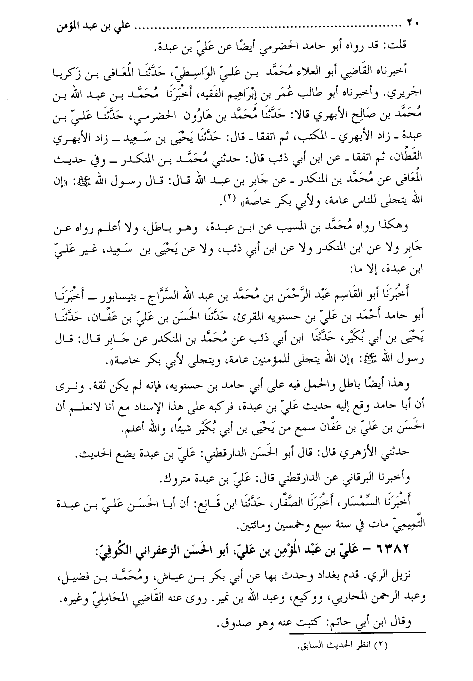 أَخْبَرَنَاهُ الْقَاضِي أَبُو الْعَلاءِ مُحَمَّدُ بْنُ عَلِيٍّ الواسطي، حَدَّثَنَا الْمُعَافَى بْنُ زَكَرِيَّا الْجُرَيْرِيُّ. وأَخْبَرَنَاهُ أَبُو طالب عُمَر بْن إِبْرَاهِيمَ الفقيه، أَخْبَرَنَا مُحَمَّد بْن عَبْد اللَّه بْن مُحَمَّد بْنِ صَالِحٍ الأَبْهَرِيُّ قَالا: حَدَّثَنَا مُحَمَّدُ بْنُ هارون الحضرمي، حَدَّثَنَا عَلِيُّ بْنُ عَبْدَةَ- زَادَ الأَبْهَرِيُّ- الْمُكْتِبَ، ثُمَّ اتَّفَقَا- قَالَ: حَدَّثَنَا يَحْيَى بْنُ سَعِيدٍ- زَادَ الأَبْهَرِيُّ الْقَطَّانَ، ثُمَّ اتَّفَقَا- عَنِ ابْنِ أَبِي ذِئْبٍ قَالَ: حَدَّثَنِي مُحَمَّدُ بْنُ الْمُنْكَدِرِ- وَفِي حَدِيثِ الْمُعَافَى عَنْ مُحَمَّدِ بْنِ الْمُنْكَدِرِ- عَنْ جَابِرِ بْنِ عَبْدِ اللَّهِ قَالَ: قَالَ رَسُولُ اللَّهِ صَلَّى اللَّهُ عَلَيْهِ وسلم: «إن اللَّهَ يَتَجَلَّى لِلنَّاسِ عَامَّةً، وَلأَبِي بَكْرٍ خَاصَّةً» [1] .