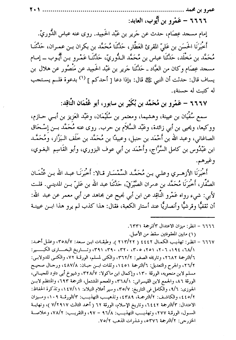 6667- عمرو بْن مُحَمَّد بْن بكير بْن سابور، أَبُو عثمان الناقد [3] :