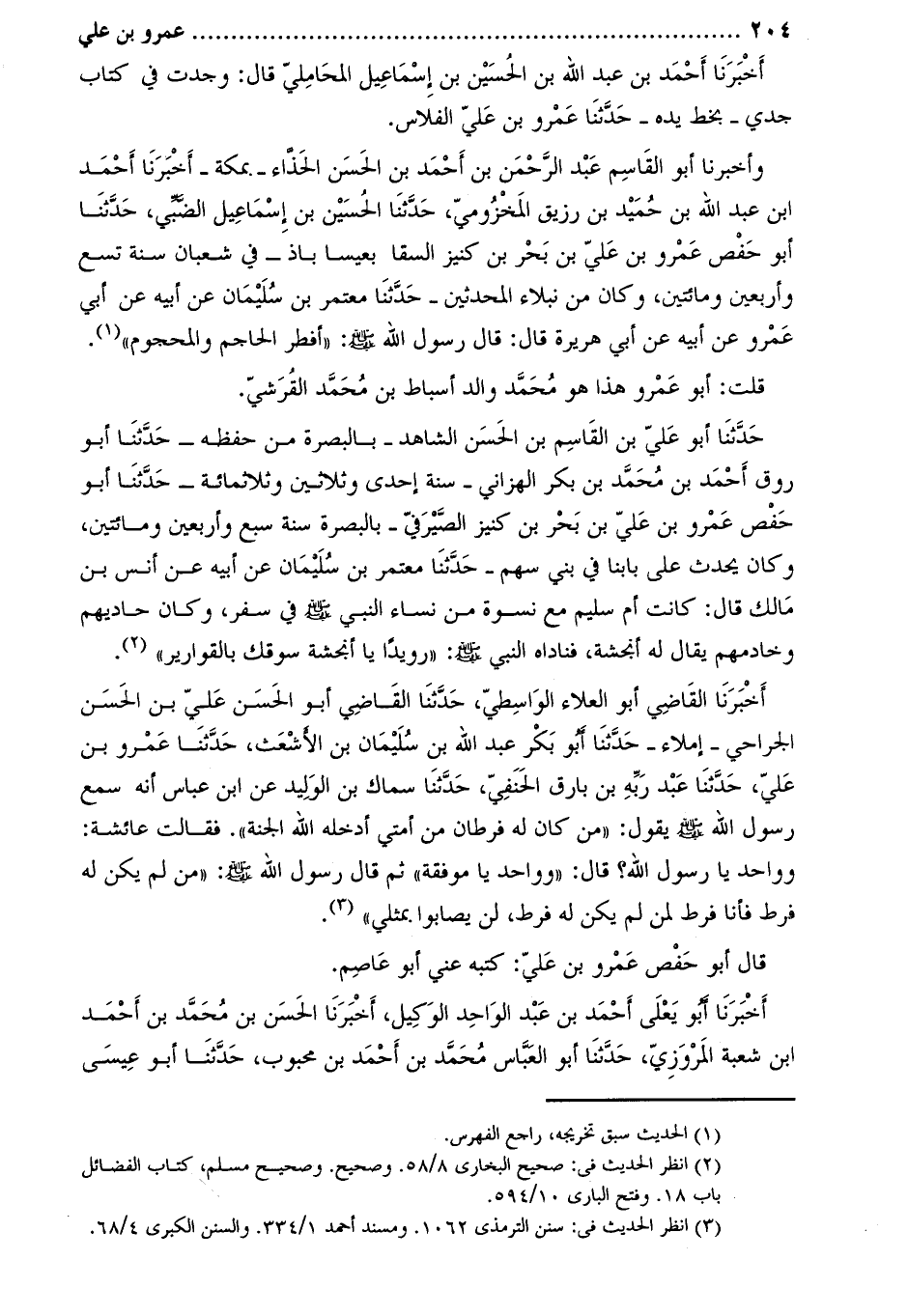 وأَخْبَرَنَا أَبُو الْقَاسِم عَبْد الرَّحْمَن بْن أَحْمَدَ بْنِ الحَسَن الحذّاء- بمكة- أخبرنا أحمد ابن عَبْدِ اللَّهِ بْنِ حُمَيْدِ بْنِ رُزَيْقٍ الْمَخْزُومِيُّ، حدّثنا الحسين بن إسماعيل الضّبيّ، حَدَّثَنَا أَبُو حَفْصٍ عَمْرُو بْنُ عَلِيِّ بْنِ بحر بن كنيز السقاء بعيسى آباذ- فِي شَعْبَانَ سَنَةَ تِسْعٍ وَأَرْبَعِينَ وَمِائَتَيْنِ، وَكَانَ من نبلاء المحدثين- حدثنا معتمر بن سليمان عن أبيه عن أَبِي عَمْرٍو عَنْ أَبِيهِ عَنْ أَبِي هُرَيْرَةَ قَالَ: قَالَ رَسُولُ اللَّهِ صَلَّى اللَّهُ عَلَيْهِ وَسَلَّمَ: «أَفْطَرَ الْحَاجِمُ وَالْمَحْجُومُ» [1] .
