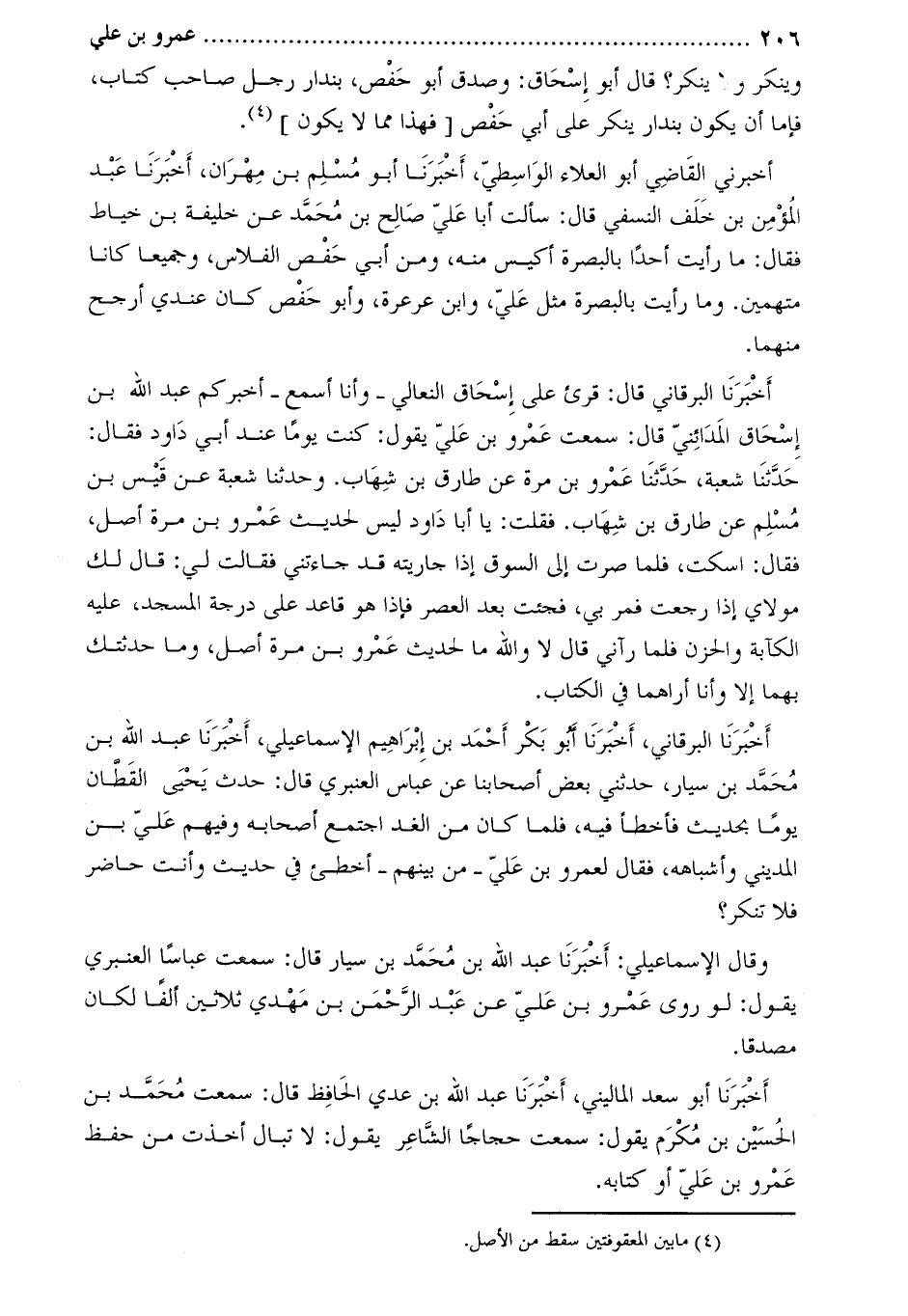 أَخْبَرَنَا أَبُو سعد الماليني، أَخْبَرَنَا عَبْد اللَّه بْن عدي الْحَافِظُ قَالَ: سَمِعْتُ مُحَمَّد بْن الْحُسَيْن بْن مكرم يقول: سمعت حجاجا الشّاعر يقول: لا تبال أخذت من حفظ عمرو بن عليّ أو كتابه.