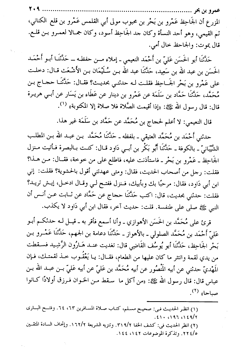 حَدَّثَنَا أَبُو الْحَسَنِ عَلِيُّ بْنُ أَحْمَدَ النُّعَيْمِيُّ- إملاء من حفظه- حَدَّثَنَا أَبُو أَحْمَد الْحَسَن بْن عَبْدِ اللَّهِ بْن سعيد، حَدَّثَنَا عَبْدُ اللَّهِ بْنُ سُلَيْمَانَ بْنِ الأَشْعَثِ قَالَ: دَخَلْتُ عَلَى عَمْرِو بْنِ بَحْرٍ الْجَاحِظِ فَقُلْتُ لَهُ حَدِّثْنِي بِحَدِيثٍ؟ فَقَالَ: حَدَّثَنَا حَجَّاجُ بن محمّد، حَدَّثَنَا حَمَّادُ بْنُ سَلَمَةَ عَنْ عَمْرِو بْنِ دِينَارٍ عَنْ عَطَاءِ بْنِ يَسَارٍ عَنْ أَبِي هُرَيْرَةَ قَالَ: قَالَ رَسُولُ اللَّهِ صَلَّى اللَّهُ عَلَيْهِ وَسَلَّمَ: «إِذَا أُقِيمَتِ الصَّلاةُ فَلا صَلاةَ إِلا الْمَكْتُوبَةُ» [1] .