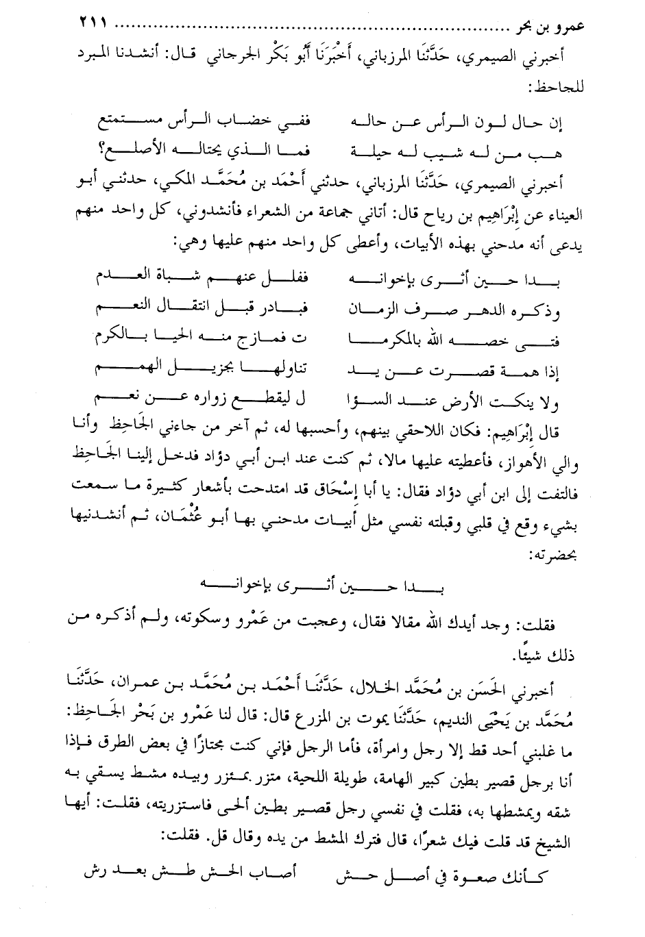 أخبرني الصيمري، حدّثنا المرزباني، أَخْبَرَنَا أَبُو بَكْر الجرجاني قَالَ: أنشدنا المبرد للجاحظ: