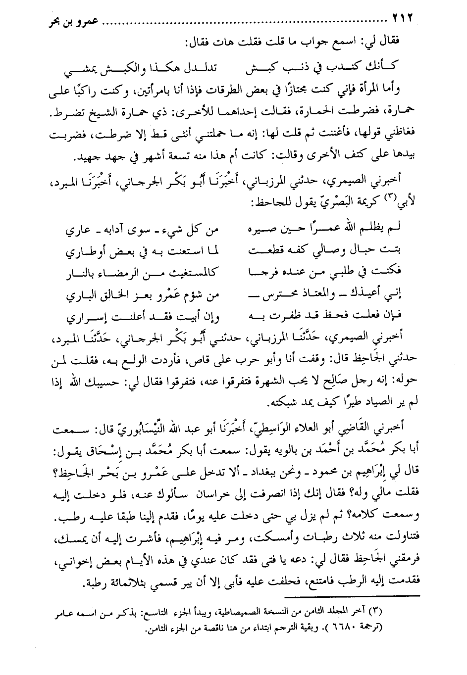 أخبرني الصيمري، حدثني المرزباني، أخبرنا أبو بكر الجرجاني، أَخْبَرَنَا المبرد، لأبي [1] كريمة البصري يقول للجاحظ: