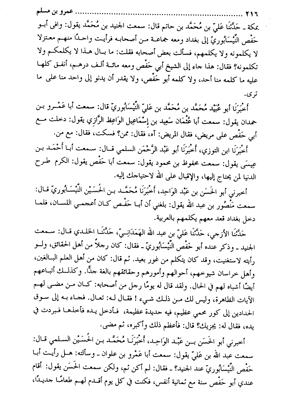 بمكة- حَدَّثَنَا عَلِيّ بْن مُحَمَّدِ بْنِ حاتم قَالَ: سمعت الجنيد بْن مُحَمَّد يقول: وافى أَبُو حفص النيسابوري إلى بغداد ومعه جماعة من أصحابه فرأيت واحدا منهم معتزلا لا يكلمونه ولا يكلمهم، فسألت بعض أصحابه فقلت: ما بال هذا لا يكلمكم ولا تكلمونه؟ فقال: هذا جاء إلى الشيخ أبي حفص ومعه مائة ألف درهم، أنفق كلها عليه ما كلمه منا أحد، ولا كلمه أَبُو حفص، ولا يقدر أن يدنو إلى واحد منا على ما ترى.