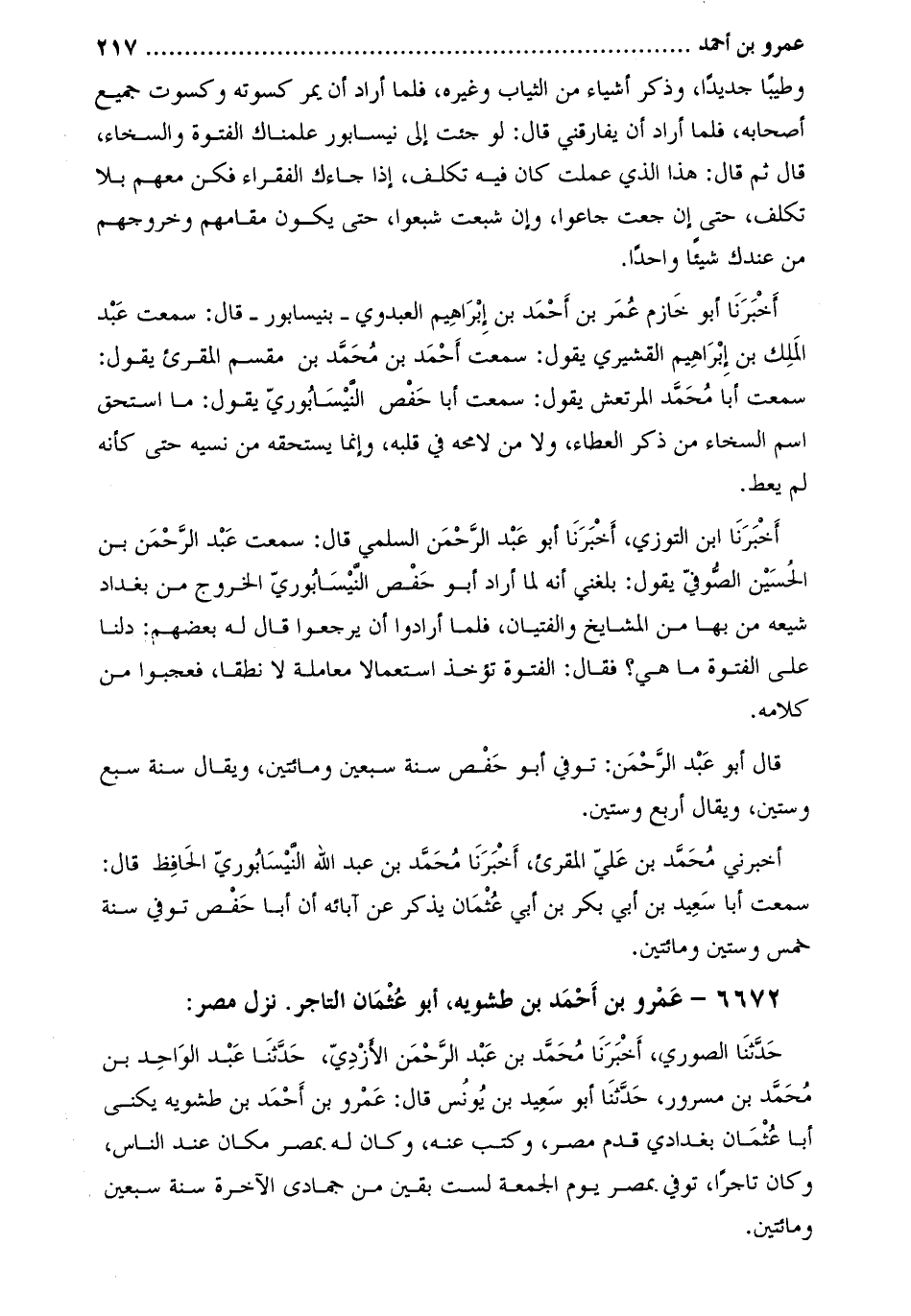 أَخْبَرَنَا ابْن التوزي، أَخْبَرَنَا أَبُو عَبْد الرَّحْمَنِ السلمي قَالَ: سمعت عبد الرحمن بْن الحسين الصوفي يقول: بلغني أنه لما أراد أَبُو حفص النيسابوري الخروج من بغداد شيعه من بها من المشايخ والفتيان، فلما أرادوا أن يرجعوا قَالَ له بعضهم: دلنا على الفتوة ما هي؟ فقال: الفتوة تؤخذ استعمالا معاملة لا نطقا، فعجبوا من كلامه.