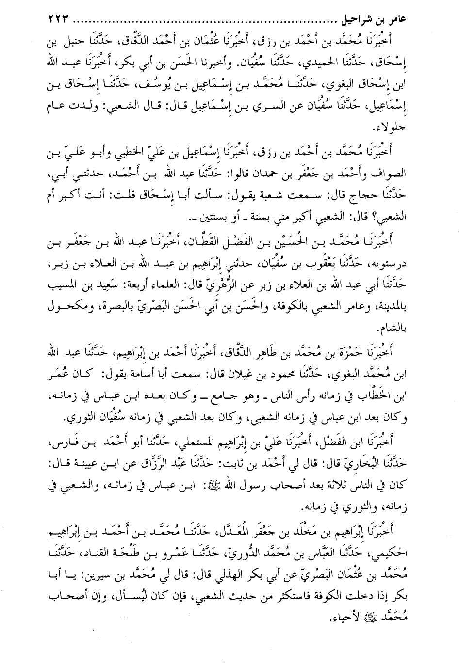 أخبرنا محمّد بن أحمد بن رزق، أخبرنا عثمان بن أحمد الدّقّاق، حدّثنا حنبل بن إسحاق، حدّثنا الحميدي، حَدَّثَنَا سفيان. وَأَخْبَرَنَا الْحَسَن بْن أَبِي بَكْر، أخبرنا عَبْد اللَّهِ ابن إسحاق البغوي، حدّثنا محمّد بن إسماعيل بن يوسف، حدّثنا إسحاق بن إسماعيل، حَدَّثَنَا سفيان عَنِ السري بْن إسماعيل قَالَ: قَالَ الشعبي: ولدت عام جلولاء.