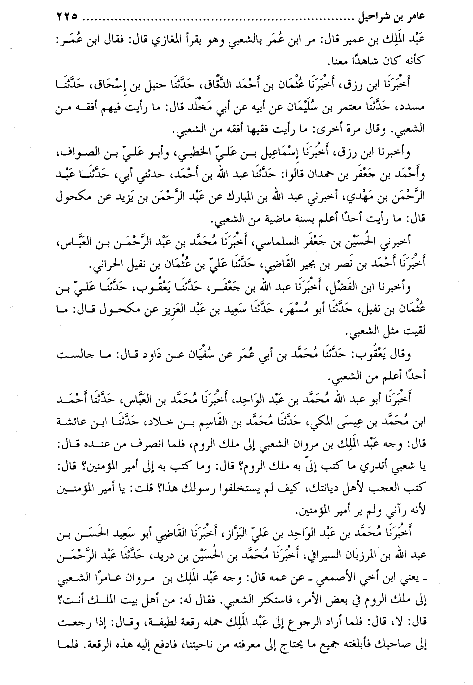 أَخْبَرَنَا مُحَمَّد بْن عبد الواحد بن علي البزاز، أَخْبَرَنَا القاضي أَبُو سعيد الْحَسَن بْن عَبْد اللَّهِ بْن المرزبان السيرافي، أخبرنا محمّد بن الحسين بن دريد، حَدَّثَنَا عبد الرحمن- يعني ابْن أخي الأصمعي- عَنْ عمه قَالَ: وجه عبد الملك بْن مروان عامرا الشعبي إلى ملك الروم في بعض الأمر، فاستكثر الشعبي. فقال له: من أهل بيت الملك أنت؟