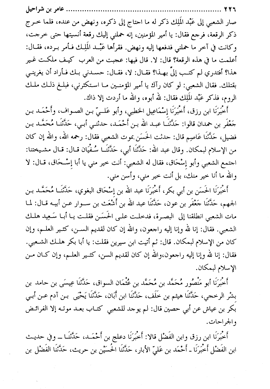 أَخْبَرَنَا ابْن رزق، أخبرنا إسماعيل الخطبي، وأبو عليّ بن الصواف، وأحمد بْن جَعْفَر بْن حمدان قالوا: حَدَّثَنَا عَبْد الله بن أحمد، حدثني أبي، حدّثنا محمّد بن فضيل، حَدَّثَنَا عاصم قَالَ: حدثت الحسن بموت الشعبي فقال: رحمه اللَّه، وَاللَّه إن كان من الإسلام لبمكان. وَقَالَ عبد اللَّه: حَدَّثَنَا أبي، حَدَّثَنَا سفيان قَالَ: قَالَ مشيختنا:
