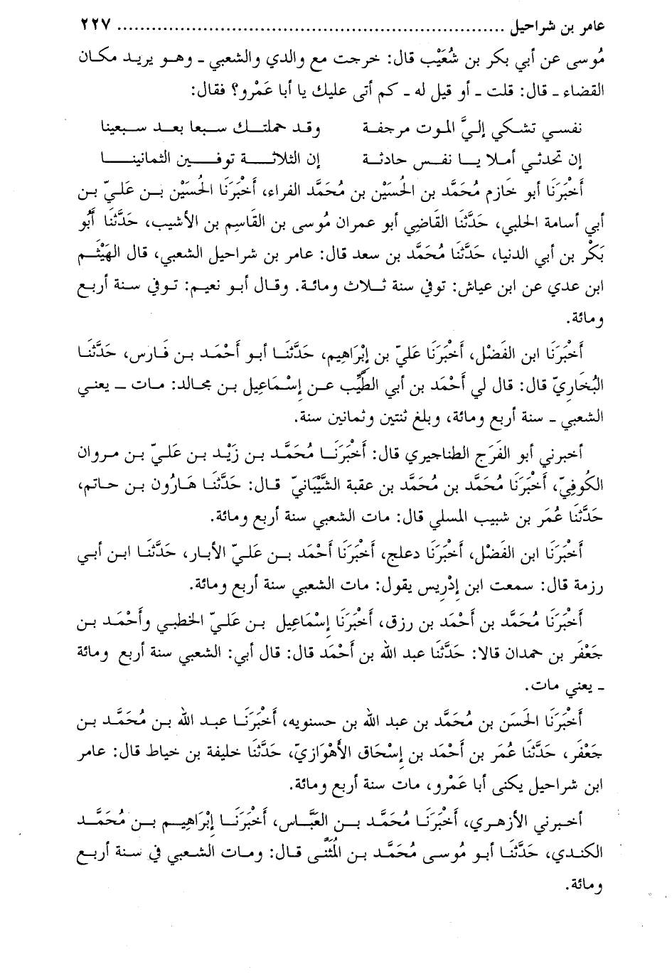 أَخْبَرَنَا أَبُو خازم مُحَمَّد بْن الْحُسَيْن بن مُحَمَّد الفراء، أَخْبَرَنَا الْحُسَيْن بْن عَلِيّ بْن أبي أسامة الحلبي، حَدَّثَنَا القاضي أَبُو عمران موسى بْن القاسم بن الأشيب، حدّثنا أبو بكر بن أبي الدنيا، حَدَّثَنَا مُحَمَّد بْن سعد قَالَ: عامر بْن شراحيل الشعبي، قال الهيثم ابن عدي عَنِ ابْنِ عياش: توفي سنة ثلاث ومائة. وَقَالَ أَبُو نعيم: توفي سنة أربع ومائة.
