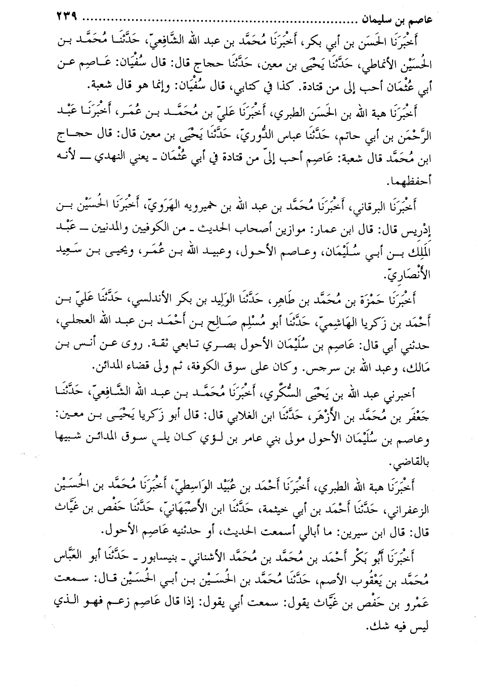 أَخْبَرَنَا هبة اللَّه الطبري، أخبرنا أحمد بن عبيد الواسطيّ، أخبرنا محمّد بن الحسين الزعفراني، حدّثنا أحمد بن أبي خيثمة، حدّثنا ابن الأصبهانيّ، حَدَّثَنَا حفص بْن غياث قَالَ: قَالَ ابْن سيرين: ما أبالي أسمعت الحديث، أو حَدَّثَنِيه عاصم الأحول.