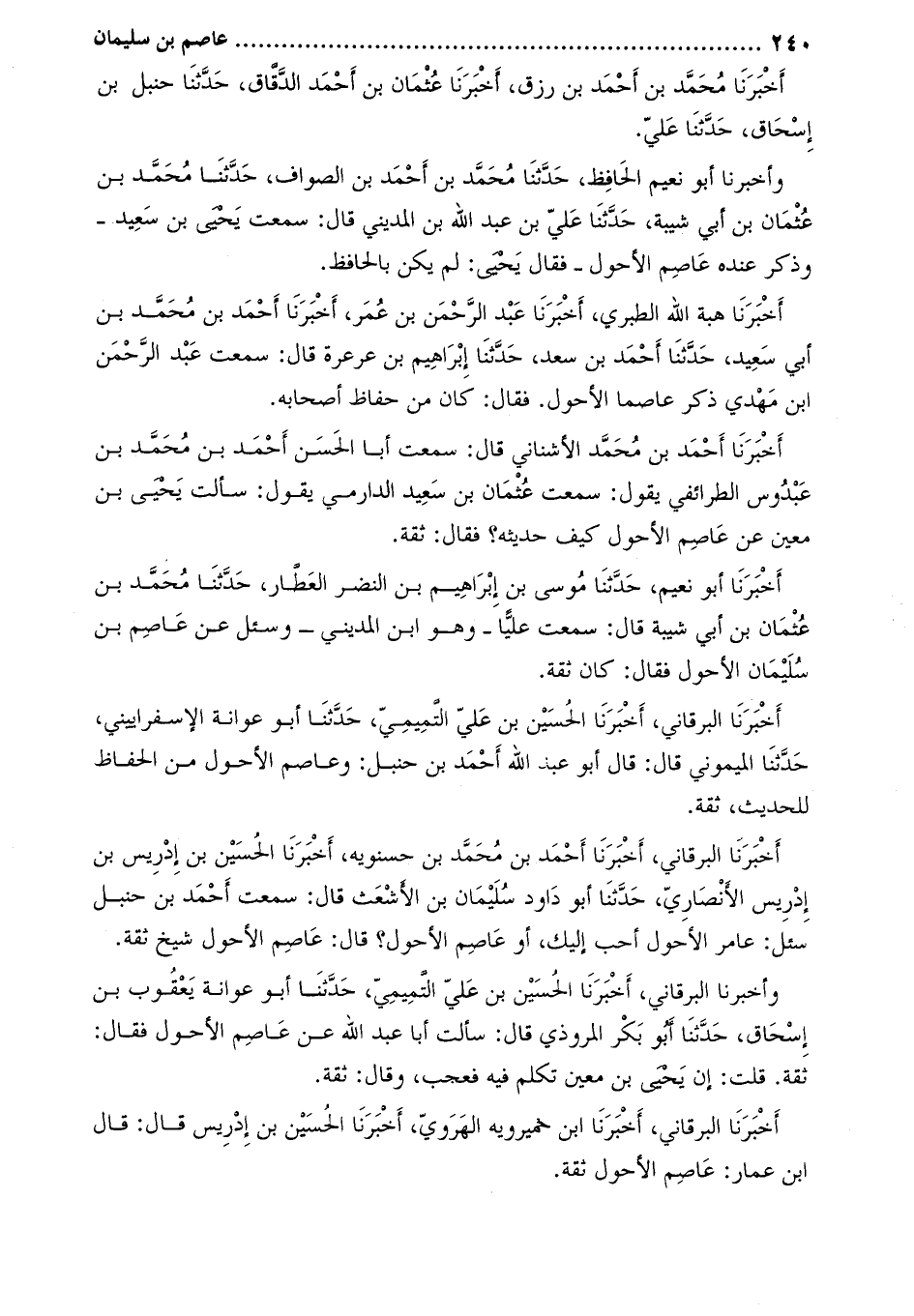 أخبرنا أبو نعيم، حَدَّثَنَا مُوسَى بْن إِبْرَاهِيمَ بْن النَّضْر الْعَطَّار، حدثنا محمد بن عثمان بن أبي شيبة قَالَ: سمعتُ عليًّا- وهو ابْن الْمَدِينِيّ- وسئل عَنْ عاصم بْن سليمان الأحول فقال: كان ثقة.