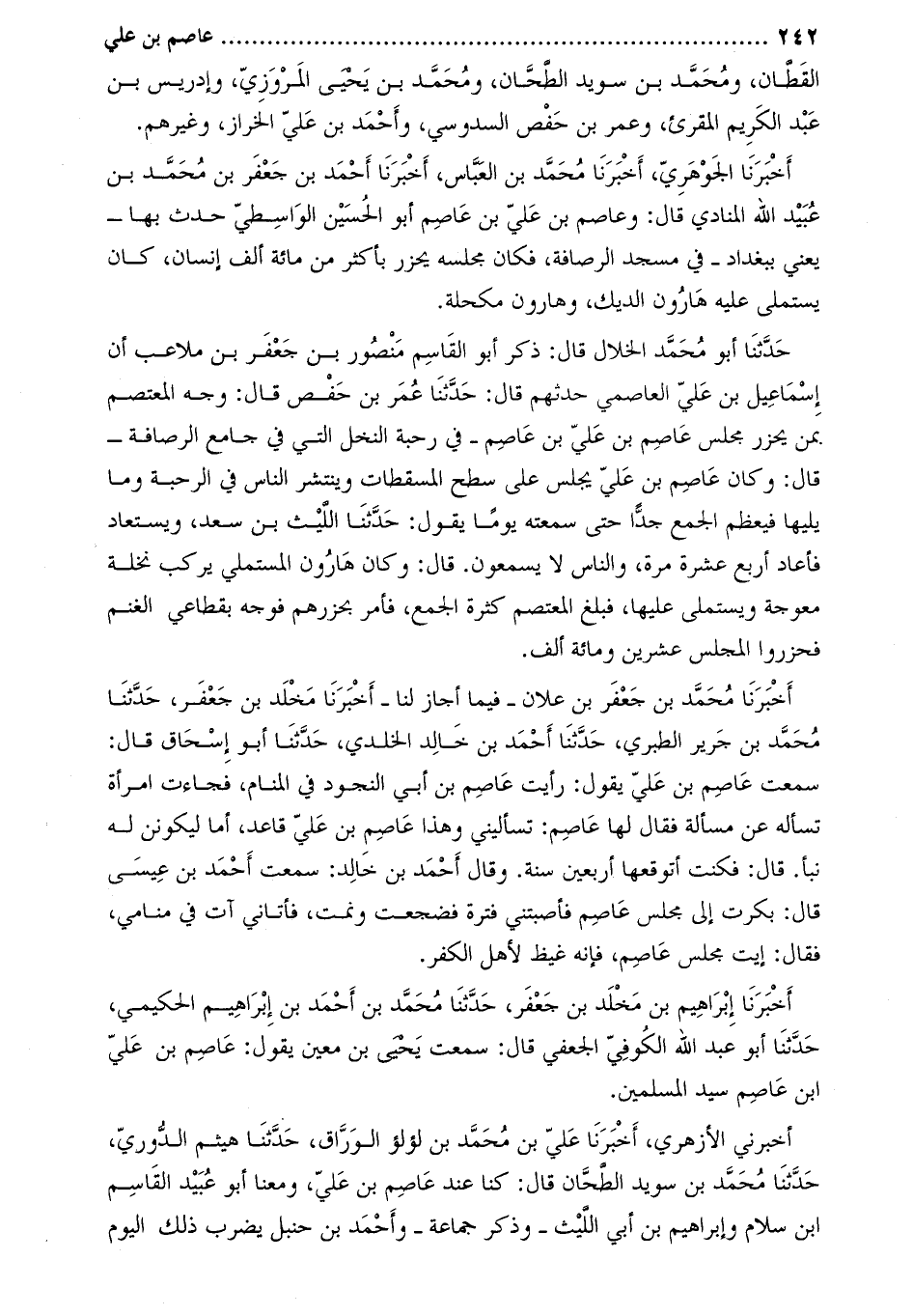 حَدَّثَنَا أَبُو مُحَمَّد الخلال قَالَ: ذكر أَبُو القاسم منصور بْن جعفر بْن ملاعب أن إسماعيل بْن علي العاصمي حدثهم قَالَ: حَدَّثَنَا عمر بْن حفص قَالَ: وجه المعتصم بمن يحرز مجلس عاصم بْن علي بْن عاصم- في رحبة النخل التي في جامع الرصافة- قَالَ: وكان عاصم بْن علي يجلس على سطح المسقطات وينتشر الناس في الرحبة وما يليها فيعظم الجمع جدا حتى سمعته يوما يقول: حَدَّثَنَا الليث بْن سعد، ويستعاد فأعاد أربع عشرة مرة، والناس لا يسمعون. قَالَ: وكان هارون المستملي يركب نخلة معوجة ويستملي عليها، فبلغ المعتصم كثرة الجمع، فأمر بحزرهم فوجه بقطاعي الغنم فحزروا المجلس عشرين ومائة ألف.