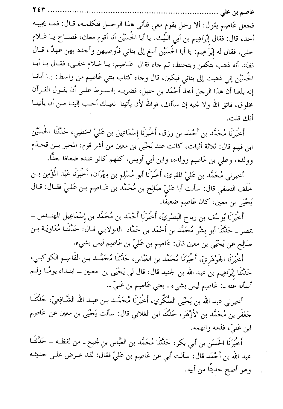 أخبرني محمّد بن عليّ المقرئ، أخبرنا أبو مسلم بن مهران، أخبرنا عبد المؤمن بن خلف النسفي قال: سألت أبا علي صالح بْن مُحَمَّد بْن عاصم بْن علي فقال: قَالَ يحيى بْن معين، كان عاصم ضعيفا.