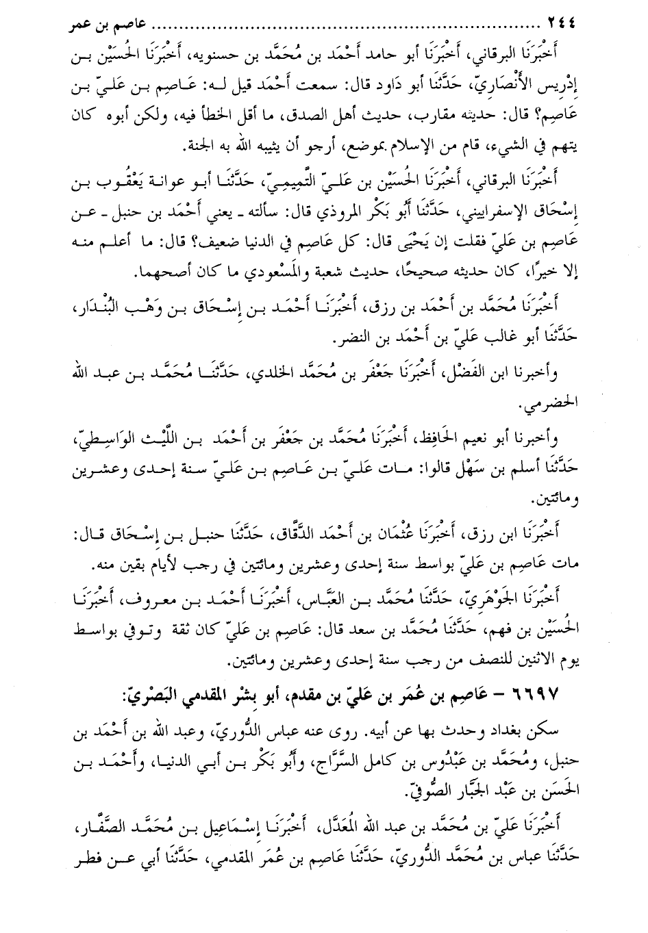 6697- عاصم بْن عمر بْن علي بْن مقدم، أَبُو بشر المقدمي البصري: