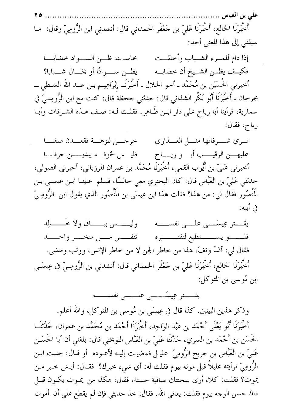 أَخْبَرَنَا الخالع، أَخْبَرَنَا علي بْن جعفر الحمداني قَالَ: أنشدني بن الرّوميّ في عيسى ابن موسى بن المتوكل:
