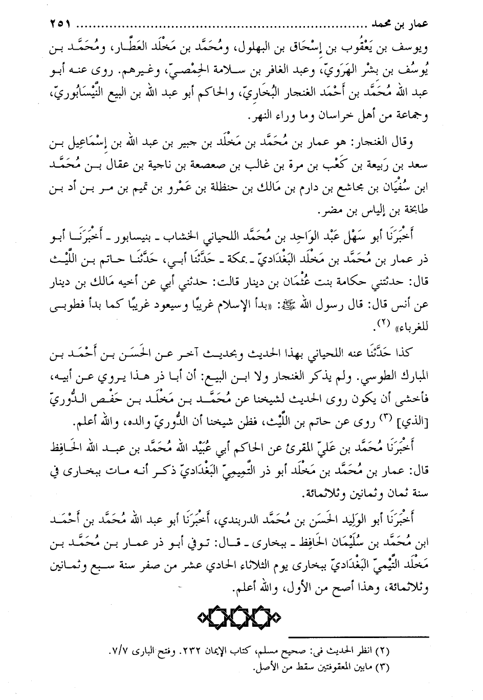 أَخْبَرَنَا أَبُو سَهْلٍ عَبْدُ الْوَاحِدِ بْنُ محمّد اللحياني الخشاب- بنيسابور- أَخْبَرَنَا أَبُو ذَرٍّ عَمَّارُ بْنُ مُحَمَّدِ بْنِ مخلد البغداديّ- بمكة- حدّثنا أبي، حَدَّثَنَا حَاتِمُ بْنُ اللَّيْثِ قَالَ: حَدَّثَتْنِي حكامةُ بِنْتُ عُثْمَانَ بْنِ دِينَارٍ قَالَتْ: حَدَّثَنِي أَبِي عَنْ أَخِيهِ مَالِكِ بْنِ دِينَارٍ عَنْ أَنَسٍ قَالَ: قَالَ رَسُولُ اللَّهِ صَلَّى الله عليه وَسَلَّمَ: «بَدَأَ الإِسْلامُ غَرِيبًا وَسَيَعُودُ غَرِيبًا كَمَا بَدَأَ فَطُوبَى لِلْغُرَبَاءِ» [1] .