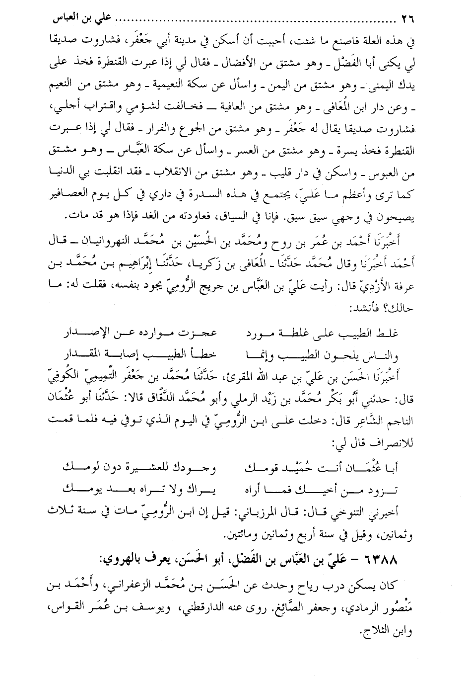 أَخْبَرَنَا أَحْمَد بْن عُمَر بْن رَوْحٍ وَمُحَمَّدُ بْن الحسين بْن مُحَمَّد النهروانيان- قَالَ أَحْمَد أَخْبَرَنَا وقَالَ مُحَمَّد حَدَّثَنَا- المعافى بن زكريا، حَدَّثَنَا إِبْرَاهِيم بْن مُحَمَّد بْن عَرَفَةَ الأَزْدِيُّ قَالَ: رأيت علي بْن العباس بْن جريج الرومي يجود بنفسه، فقلت له: ما حالك؟ فأنشد: