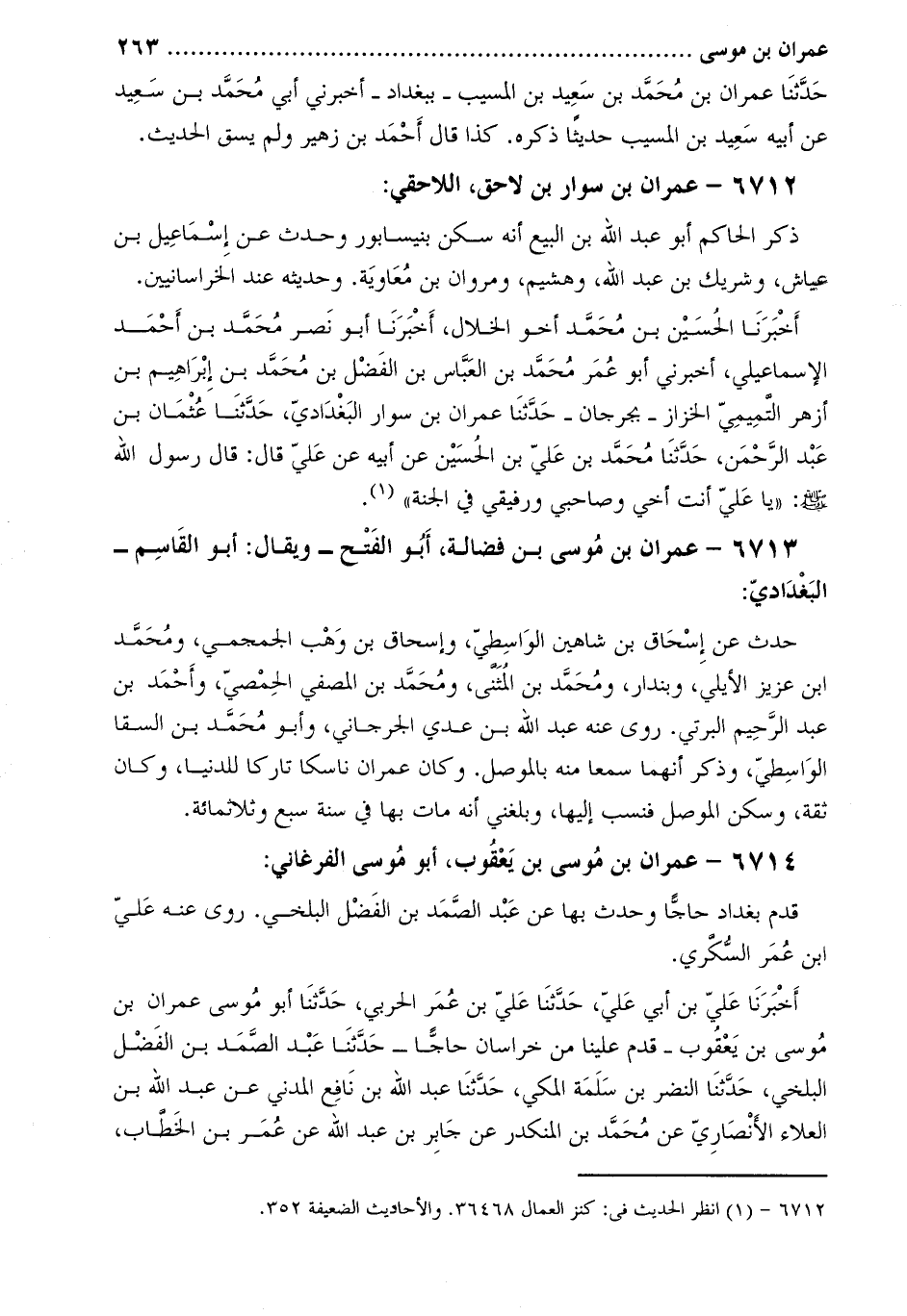 أَخْبَرَنَا الْحُسَيْنُ بْنُ مُحَمَّدٍ أَخُو الخلال، أَخْبَرَنَا أَبُو نَصْرٍ مُحَمَّدُ بْنُ أَحْمَدَ الإِسْمَاعِيلِيُّ، أَخْبَرنِي أَبُو عُمَرَ مُحَمَّدُ بْنُ الْعَبَّاسِ بْنِ الْفَضْلِ بْنِ مُحَمَّدِ بْنِ إِبْرَاهِيمَ بْنِ أَزْهَرَ التّميميّ الخزاز- بجرجان- حدّثنا عمران بن سوار البغداديّ، حدّثنا عثمان بن عبد الرّحمن، حَدَّثَنَا مُحَمَّدُ بْنُ عَلِيِّ بْنِ الْحُسَيْنِ عَنْ أَبِيهِ عَنْ عَلِيٍّ قَالَ: قَالَ رَسُولُ اللَّهِ صَلَّى اللَّهُ عَلَيْهِ وَسَلَّمَ: «يَا عَلِيُّ أَنْتَ أَخِي وَصَاحِبِي وَرَفِيقِي فِي الْجَنَّةِ» [1] .