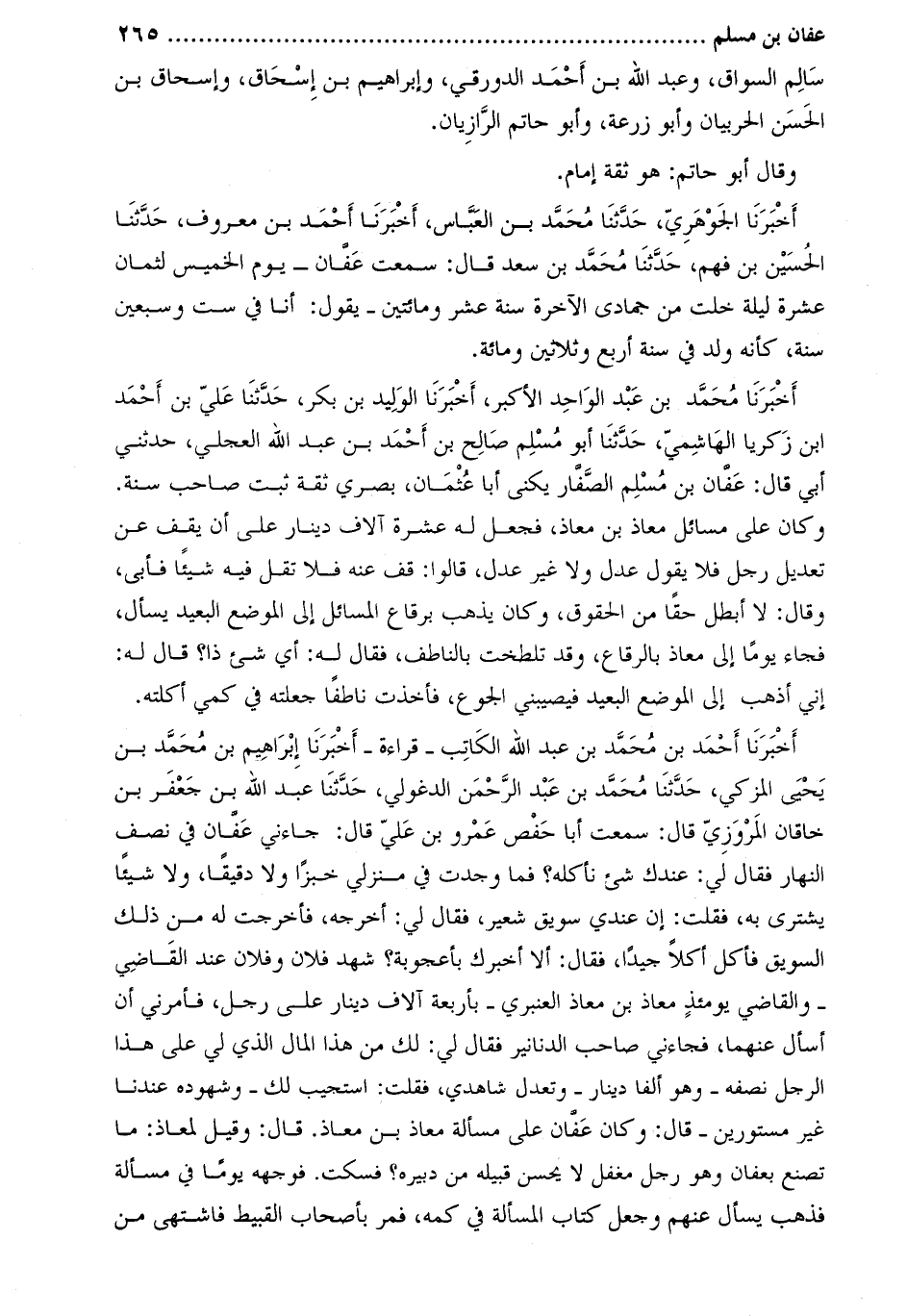 أَخْبَرَنَا مُحَمَّد بْن عبد الواحد الأكبر، أخبرنا الوليد بن بكر، حدّثنا عليّ بن أحمد ابن زكريا الهاشميّ، حدثنا أبو مسلم صالح بن أحمد بن عبد الله العجلي، حَدَّثَنِي أبي قَالَ: عفان بْن مسلم الصفار يكنى أبا عثمان، بصري ثقة ثبت صاحب سنة.