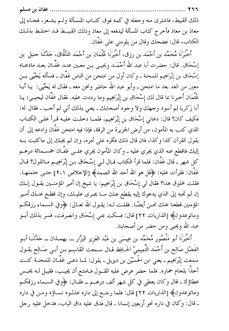 فكيف كان؟ قَالَ: دعاني إسحاق بْن إبراهيم، فلما دخلت عليه قرأ علي الكتاب الذي كتب به المأمون، من أرض الجزيرة من الرقة، فإذا فيه امتحن عفان وادعه إلى أن يقول القرآن كذا وكذا، فإن قَالَ ذلك فأقره على أمره، وإن لم يجبك إلى ما كتبت به إليك فاقطع عنه الذي يجرى عليه- وكان المأمون يجري على عفان خمسمائة درهم كل شهر- قَالَ عفان: فلما قرأ الكتاب قَالَ لي إسحاق بْن إبراهيم ما تقول؟ قَالَ عفان: فقرأت عليه: قُلْ هُوَ اللَّهُ أَحَدٌ اللَّهُ الصَّمَدُ