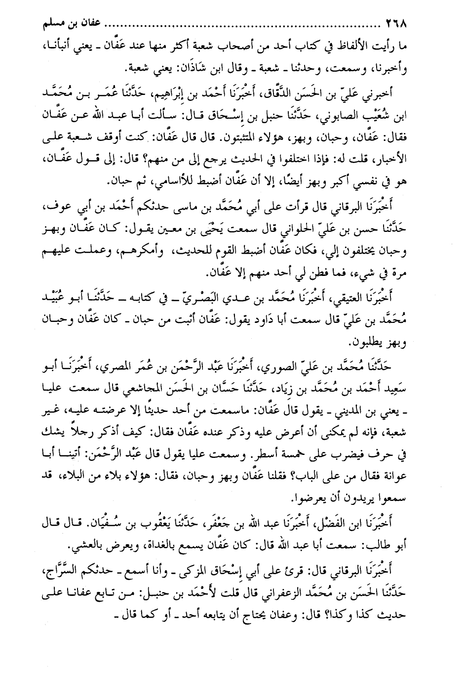 حدّثنا محمّد بن عليّ الصوري، أخبرنا عبد الرّحمن بن عمر المصري، أخبرنا أَبُو سَعِيدٍ أَحْمَدُ بْنُ مُحَمَّدِ بْنِ زِيَادٍ، حَدَّثَنَا حسان بْن الحسن المجاشعي قَالَ سمعت عليا- يعني بن المديني- يقول قَالَ عفان: ما سمعت من أحد حديثا إلا عرضته عليه، غير شعبة، فإنه لم يمكنني أن أعرض عليه وذكر عنده عفان فقال: كيف أذكر رجلا يشك في حرف فيضرب على خمسة أسطر. وسمعت عليا يقول قَالَ عبد الرحمن: أتينا أبا عوانة فقال من على الباب؟ فقلنا عفان وبهز وحبان، فقال: هؤلاء بلاء من البلاء، قد سمعوا يريدون أن يعرضوا.