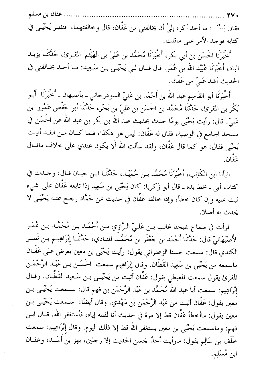 قرأت في سماع شيخنا غالب بْن علي الرازي من أَحْمَد بْن مُحَمَّد بْن عمر الأصبهاني قَالَ: حَدَّثَنَا أَحْمَدُ بْنُ جَعْفَرِ بْنِ مُحَمَّدِ المنادي، حَدَّثَنَا إبراهيم بْن نصر الكندي قَالَ: سمعت حسنا الزعفراني يقول: رأيت يحيى بْن معين يعرض على عفان ما سمعه من يحيى بْن سعيد القطان. وَقَالَ إبراهيم سمعت الحسن بْن عبد الرحمن المقرئ يقول سمعت المعيطي يقول: عفان أثبت من يحيى بْن سعيد القطان. وَقَالَ إبراهيم: سَمِعْتُ أَبَا عَبْد اللَّه مُحَمَّد بْن عَبْد الرحمن بْن فَهْم قَالَ: سمعتُ يَحْيَى بْن معين يقول: عفان أثبت من عبد الرحمن بْن مهدي. وَقَالَ أيضا: سمعت يحيى بْن معين يقول: ما أخطأ عفان قط إلا مرة في حديث أنا لقنته إياه، فأستغفر اللَّه. قَالَ ابْن فهم: وما سمعت يحيى بْن معين يستغفر اللَّه قط إلا ذلك اليوم. وَقَالَ إبراهيم: سمعت خلف بْن سالم يقول: ما رأيت أحدا يحسن الحديث إلا رجلين، بهز بن أسد، وعفان ابن مسلم.