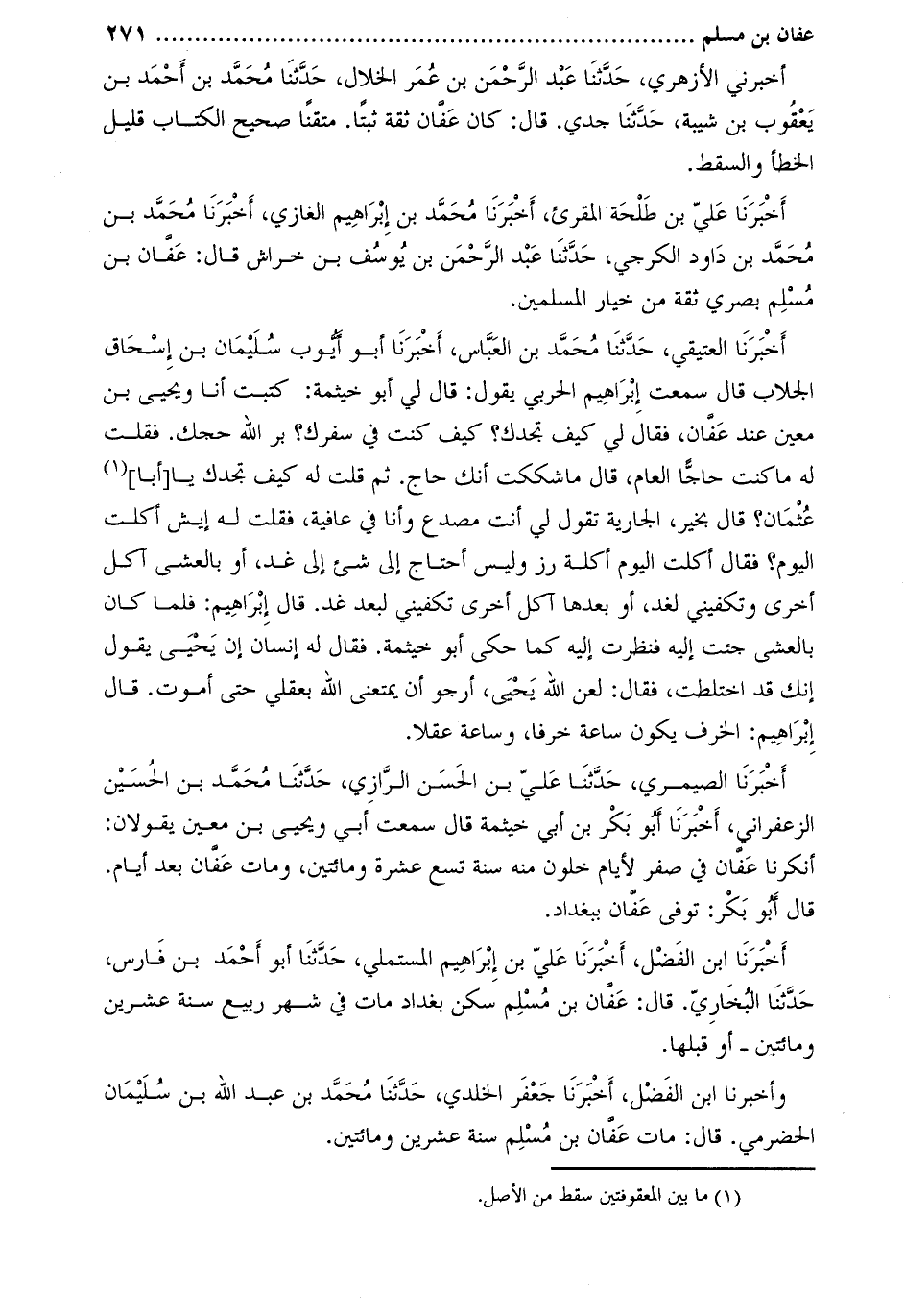 أَخْبَرَنَا عليّ بن طلحة المقرئ، أخبرنا محمّد بن إبراهيم الغازي، أخبرنا محمد بن محمد بن داود الكرجي، حَدَّثَنَا عبد الرحمن بن يوسف بن خراش قَالَ: عفان بْن مسلم بصري ثقة من خيار المسلمين.