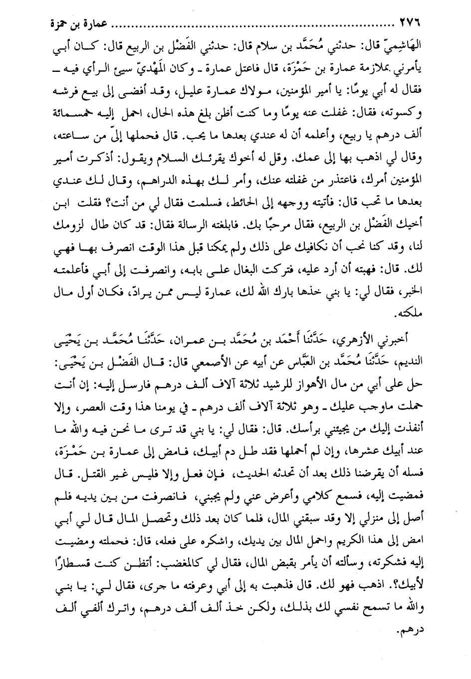 الهاشمي قَالَ: حَدَّثَنِي مُحَمَّد بْن سلام قَالَ: حَدَّثَنِي الفضل بْن الربيع قَالَ: كان أبي يأمرني بملازمة عمارة بْن حمزة، قَالَ فاعتل عمارة- وكان المهدي سيئ الرأي فيه- فقال له أبي يوما: يا أمير المؤمنين، مولاك عمارة عليل، وقد أفضى إلي بيع فرشه وكسوته، فقال: غفلت عنه يوما وما كنت أظن بلغ هذه الحال، احمل إليه خمسمائة ألف درهم يا ربيع، وأعلمه أن له عندي بعدها ما يحب. قَالَ فحملها إلىّ من ساعته، وَقَالَ لي اذهب بها إلى عمك. وقل له أخوك يقرئك السلام ويقول: أذكرت أمير المؤمنين أمرك، فاعتذر من غفلته عنك، وأمر لك بهذه الدراهم، وَقَالَ لك عندي بعدها ما تحب قَالَ: فأتيته ووجهه إلى الحائط، فسلمت فقال لي من أنت؟ فقلت ابْن أخيك الفضل بْن الربيع، فقال مرحبا بك. فأبلغته الرسالة فقال: قد كان طال لزومك لنا، وقد كنا نحب أن نكافيك على ذلك ولم يمكنا قبل هذا الوقت انصرف بها فهي لك. قال: فهبته أن أرد عليه، فتركت البغال على بابه، وانصرفت إلى أبي فأعلمته الخبر، فقال لي: يا بني خذها بارك اللَّه لك، عمارة ليس ممن يراد، فكان أول مال ملكته.